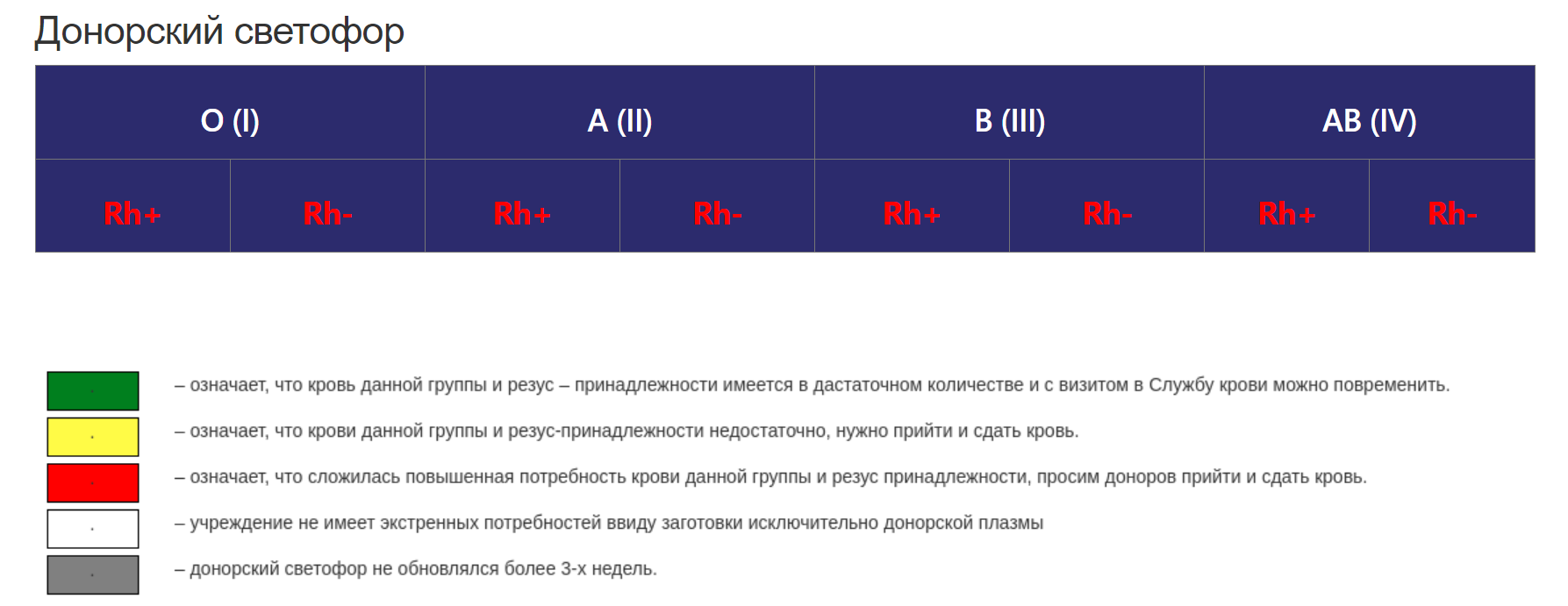 Госпиталь Военно-медицинской академии в Петербурге срочно нуждается в донорах всех групп крови. В разделе «донорский светофор» в центре крови и тканей академии все группы крови отмечены красным, что означает повышенную потребность.