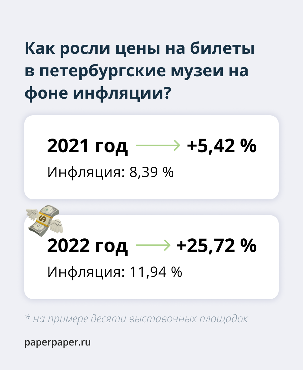 Несмотря на это, прямой корреляции между стоимостью билетов в музеи и инфляцией нет. В 2022 году средняя цена билета в музей, подсчитанная «Бумагой», выросла в два раза больше, чем потребительские цены. Годом ранее ситуация была обратной: инфляция в стране превышала рост стоимости билетов в выставочные пространства.