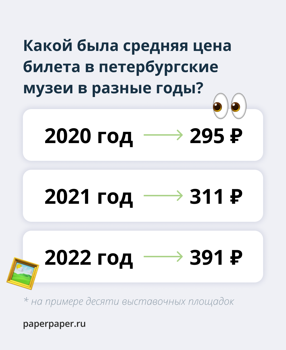 Мы изучили сайты музеев и галерей с помощью ресурса WebArchive, на котором хранятся архивные версии веб-страниц за разные годы. Для подсчета средней стоимости были выбраны десять выставочных пространств, которые не меняли виды билетов в последние три года.