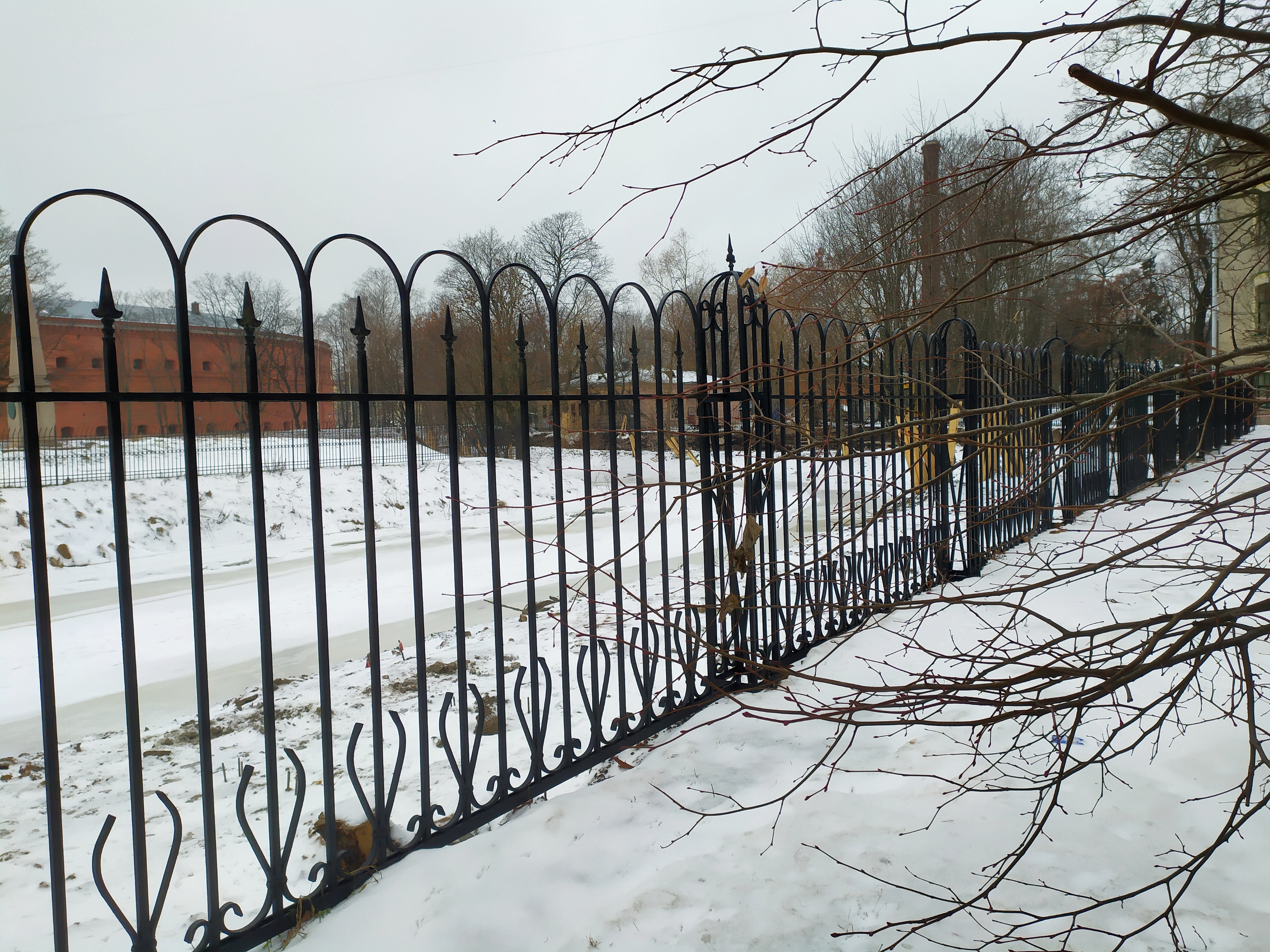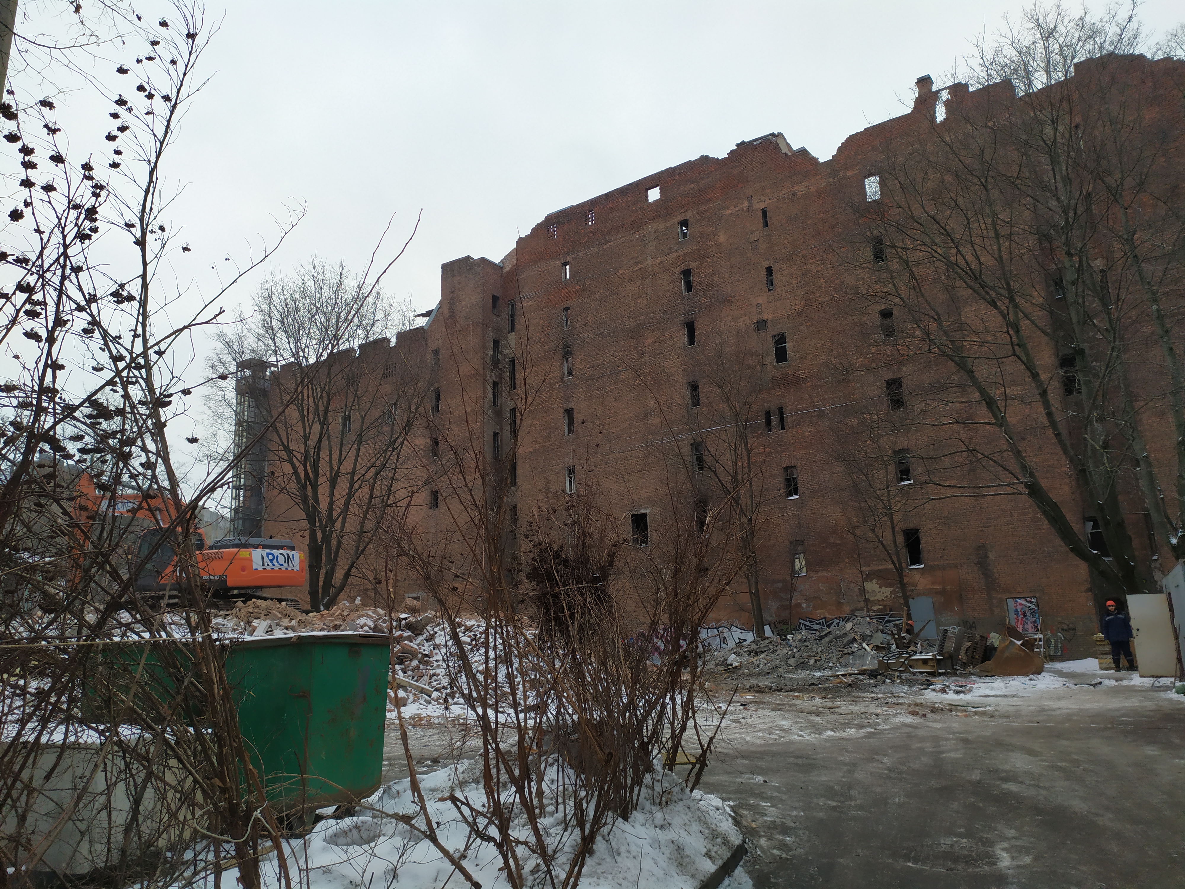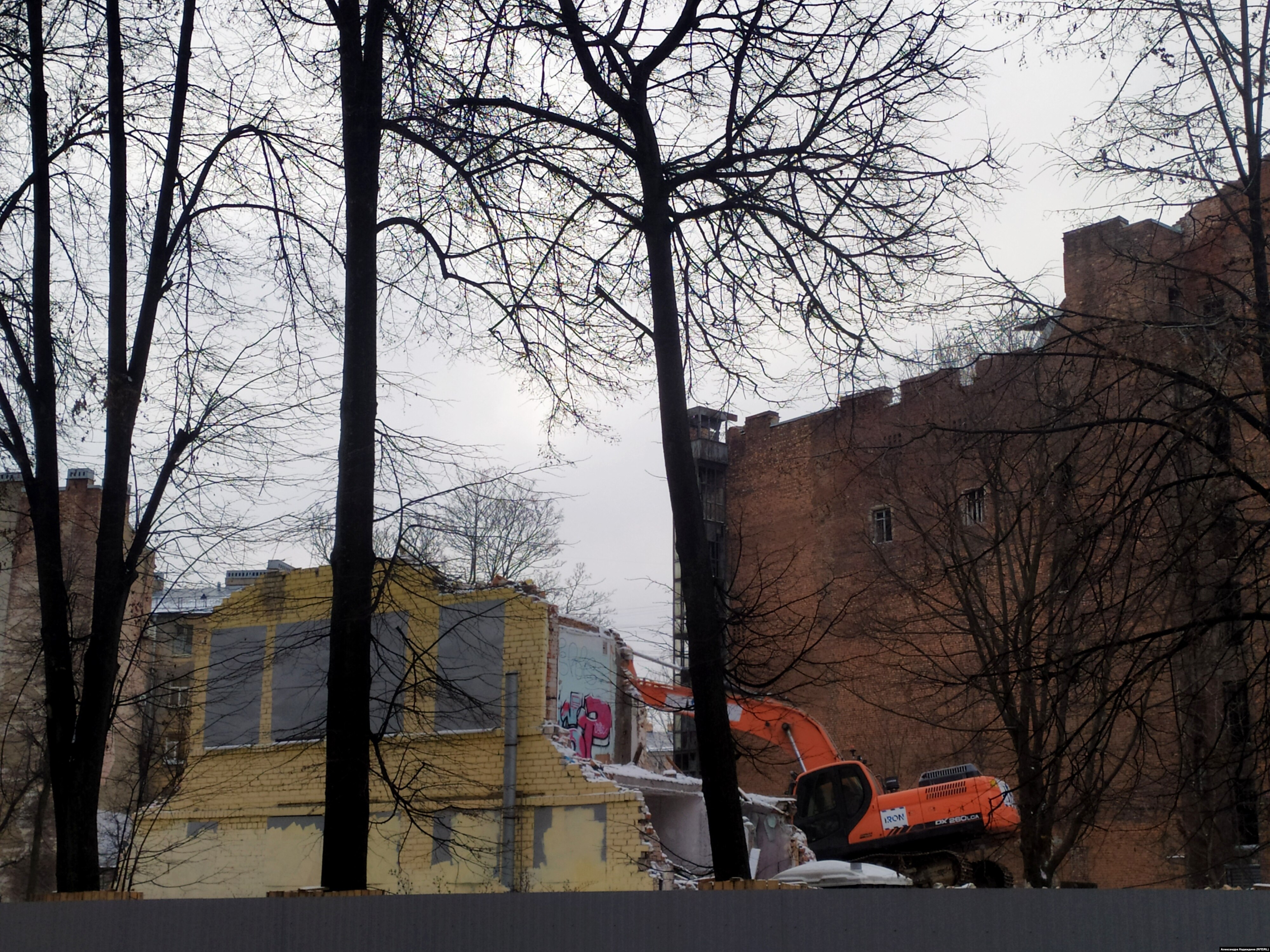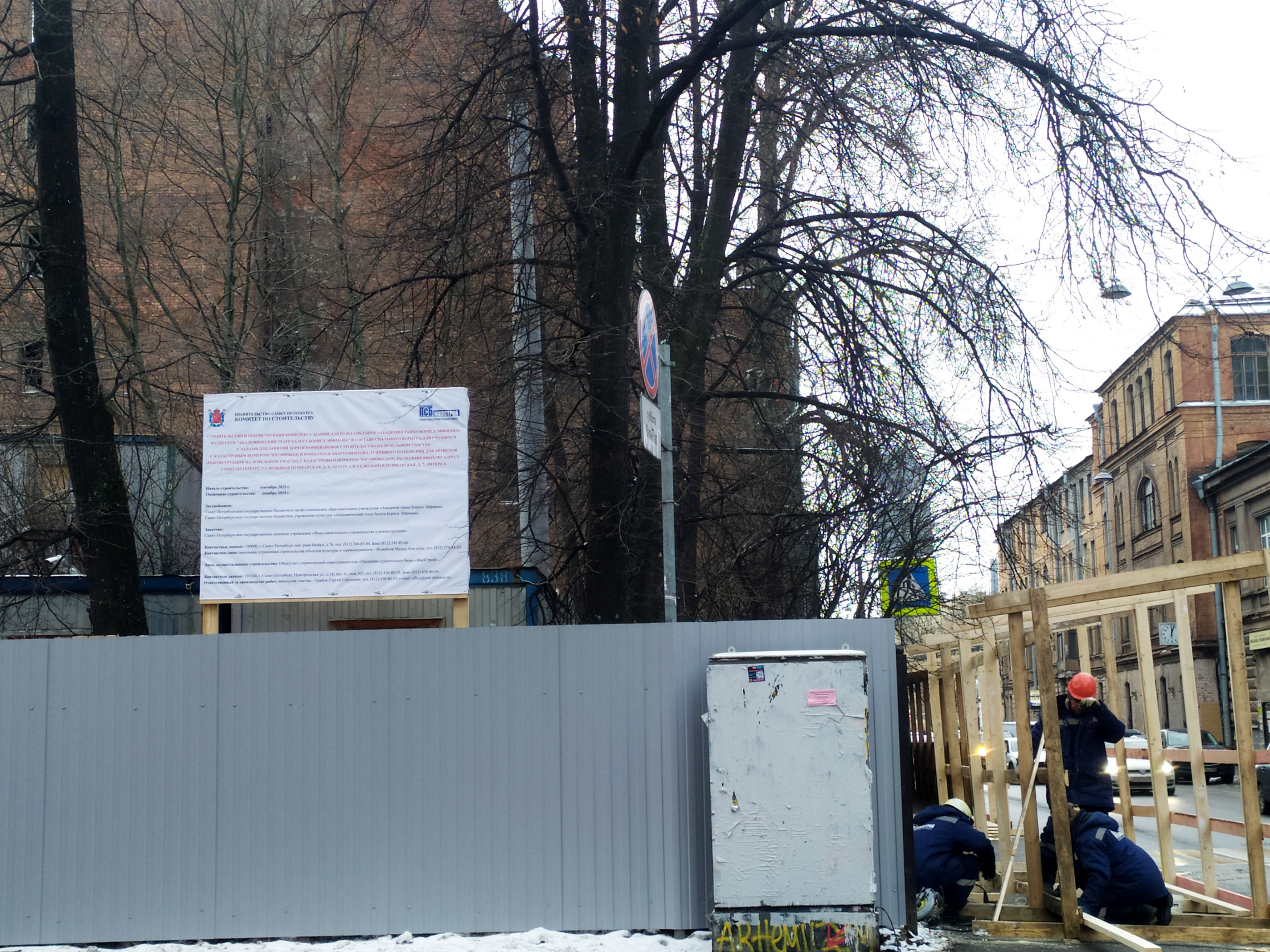 Сквозь ворота, сколоченные из профлиста, видны бытовки рабочих строительной компании "Айрон" (Iron), хорошо известной градозащитникам – она же незаконно сносила дом Шагина на Фонтанке. Рабочие курят, урчит экскаватор, садик почти исчез. Тут будут апартаменты, часть которых займет общежитие театра Эйфмана. 26 декабря Куйбышевский районный суд приостановил действие разрешения на строительство на месте дома Басевича и соседнего сквера на Большой Пушкарской, 7 и 9, но рабочих это не смущает.
