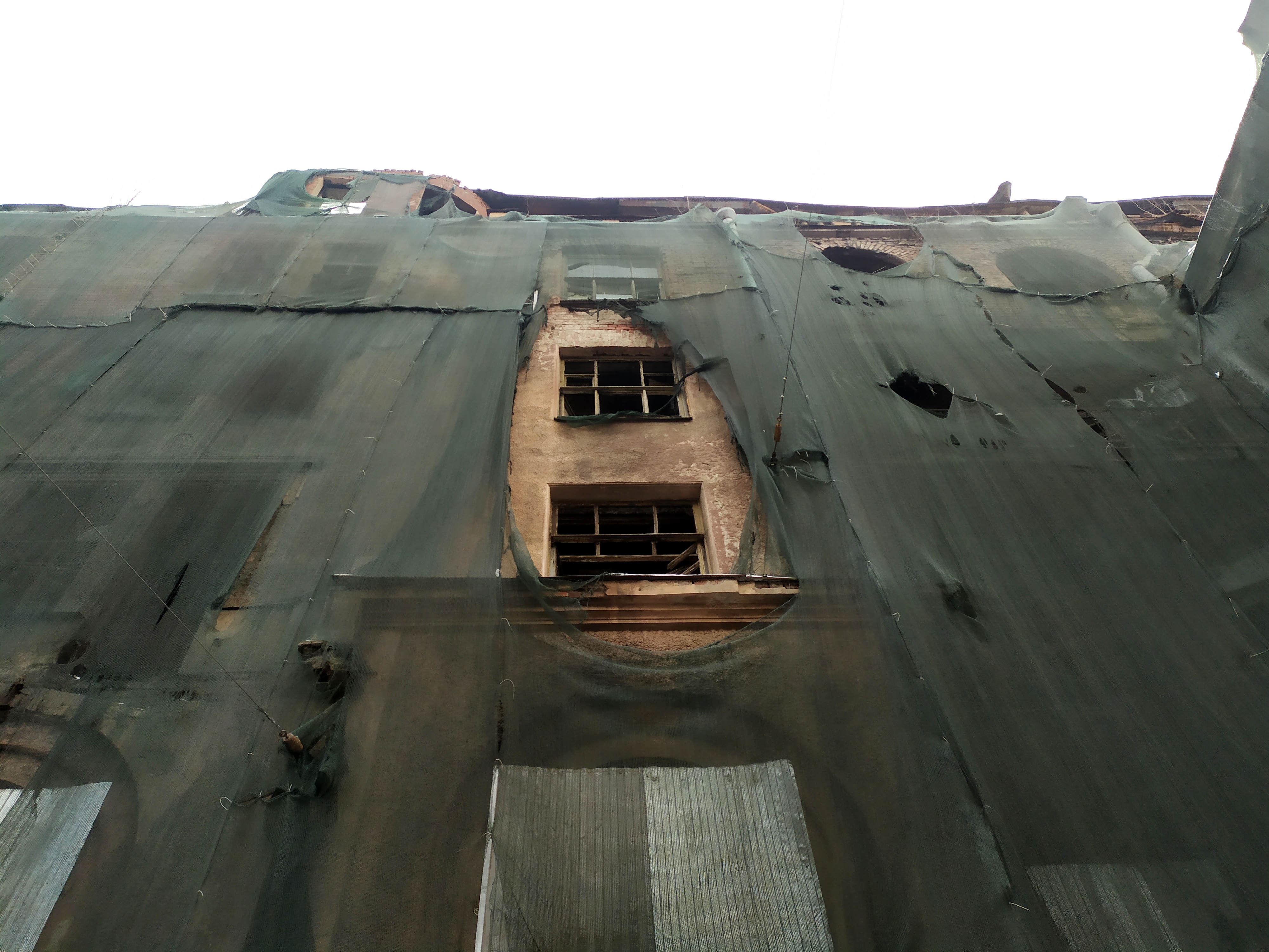 Ветер развевает зеленую маскировочную сетку, стыдливо прикрывающую каменную плоть дома, пережившего революции, войны, блокаду и теперь доведенного до катастрофического состояния. В Петербурге до сих пор живут потомки инженера Басевича, дом держится из последних сил. Даже попытки снести его во время пандемии, когда любые массовые выступления были строжайше запрещены, не удались. Активисты проводили экскурсии, записывали видеообращения, писали письма, проводили фотосессии с плакатами, не давая забыть об уничтожаемом доме.