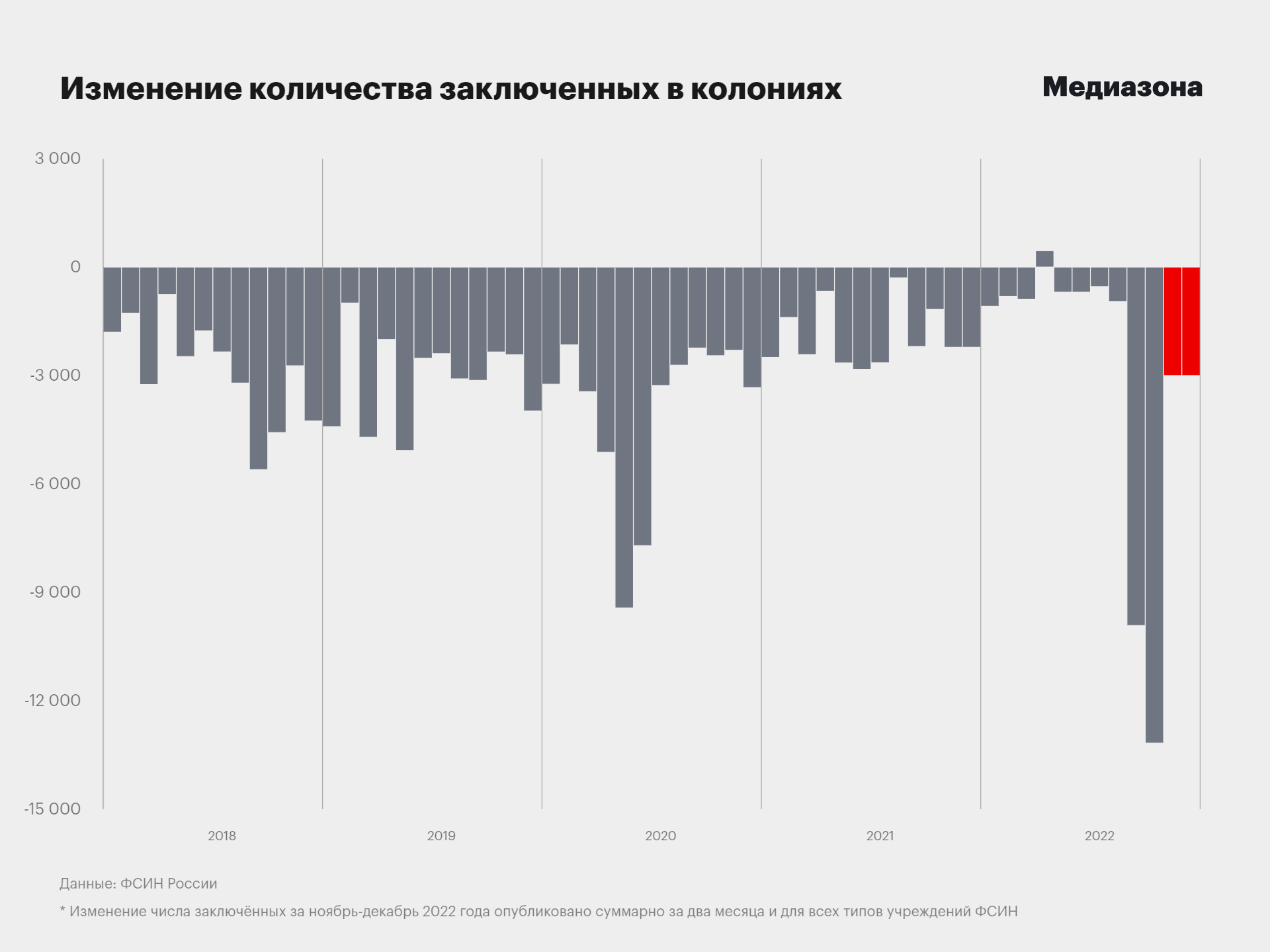 Это первое обновление статистики после того, как «Медиазона» заметила снижение количества мужчин-заключенных в исправительных колониях. В ноябре 2022 года ФСИН сообщила, что мужское тюремное население в России за два месяца сократилось на 23 тысячи человек.
