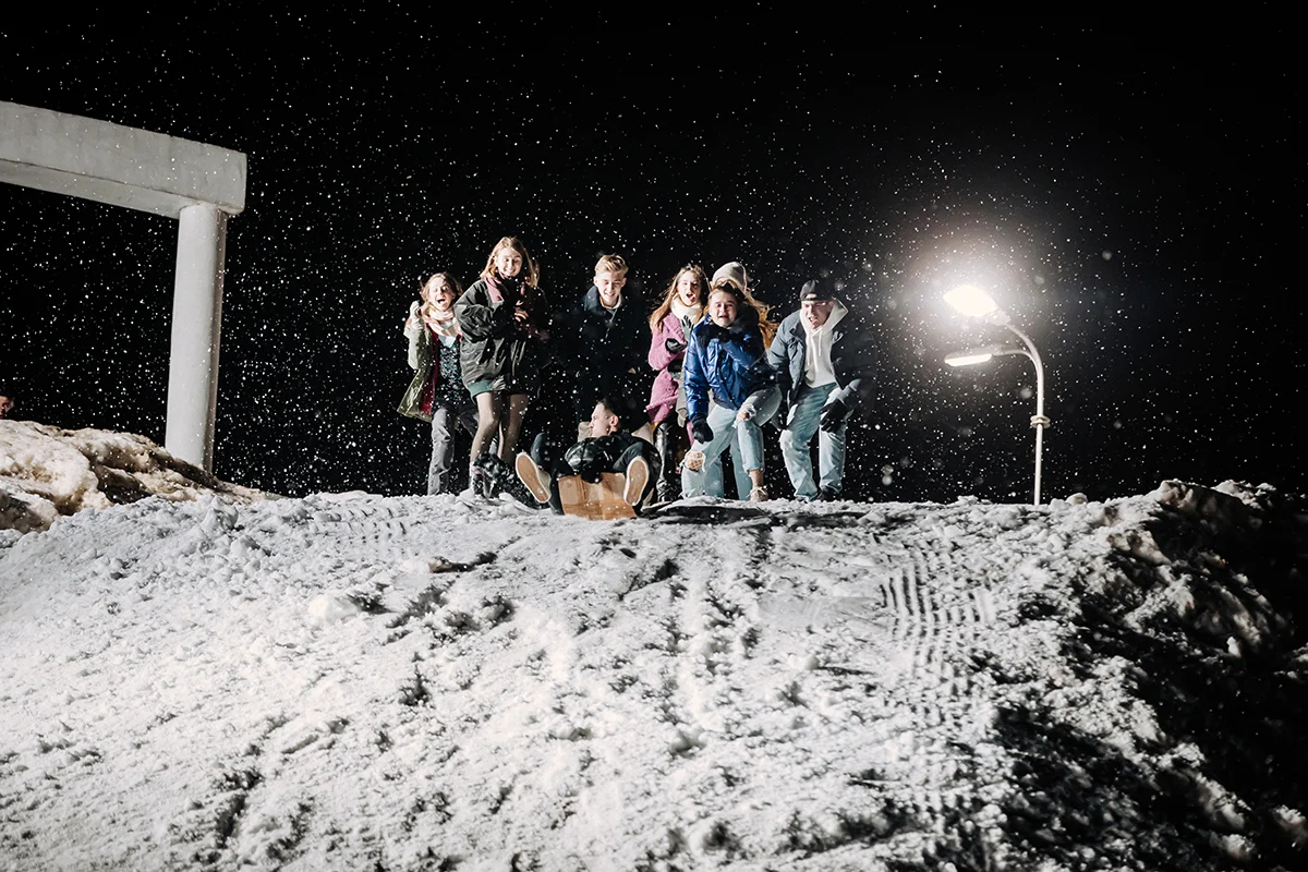 Эта ночь счастливая до самого звездного неба, до потолка в летящих световых кружках от зеркального шара, полусладкого шампанского, салюта — словно в твою честь. До сверхскоростного катания с крутейшей из гор на картонках. С паром изо рта и криком.