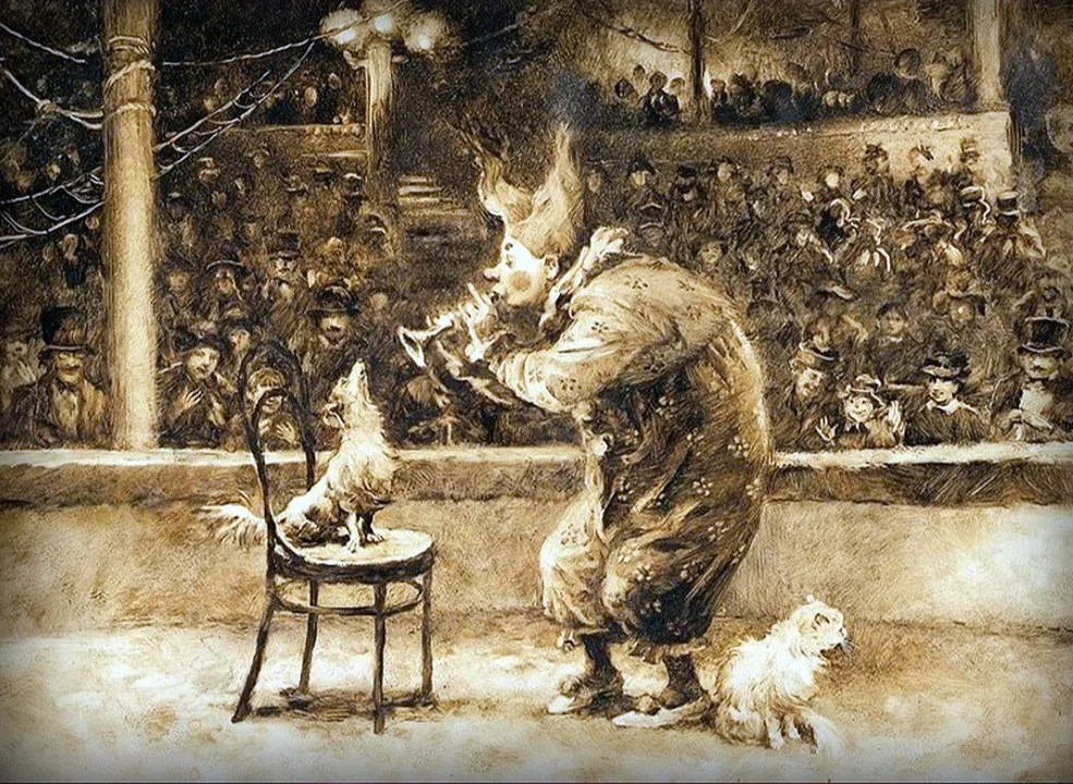 Все знакомое обрушивается в пропасть абсурда: для нас — цирк, для нее — «Босх». Бегство Каштанки с манежа неизбежно, потому что противоестественный мир не может устоять, как пирамида, составленная из дрессированных, то есть изнасилованных человеческой волей животных.