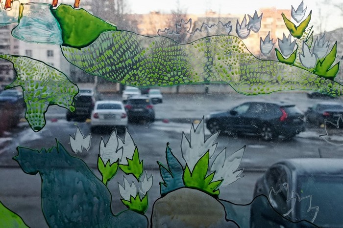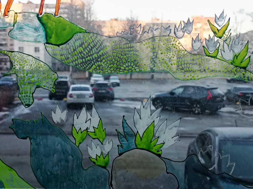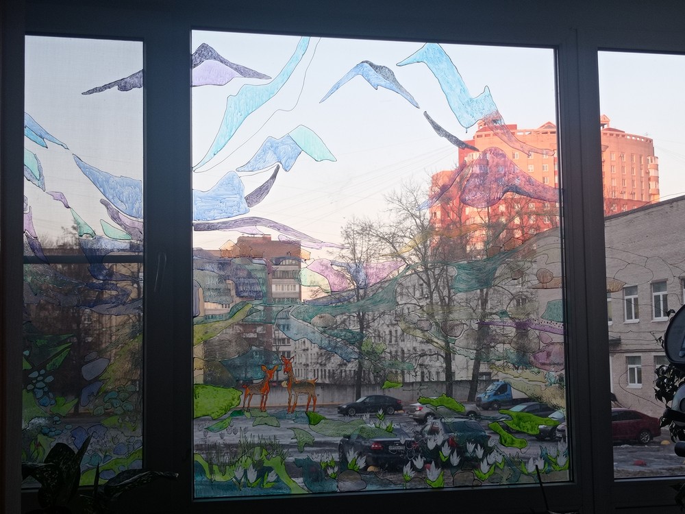 Сейчас другая художница, Лена Левина, работает над витражами в спортивном зале отделения. Здесь замысел еще более хитрый: роспись на окнах должна не перекрыть окружающее больницу пространство, а сочетаться с ним так, чтобы при определенном ракурсе многоэтажки визуально сливались с горами, а на парковке росли весенние цветы.