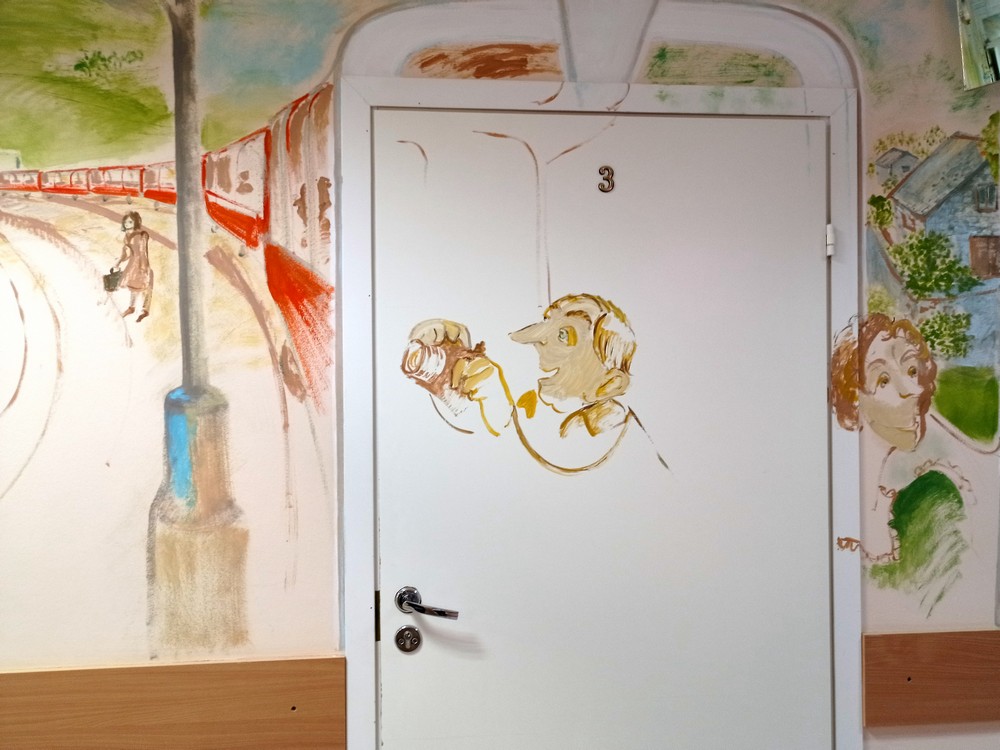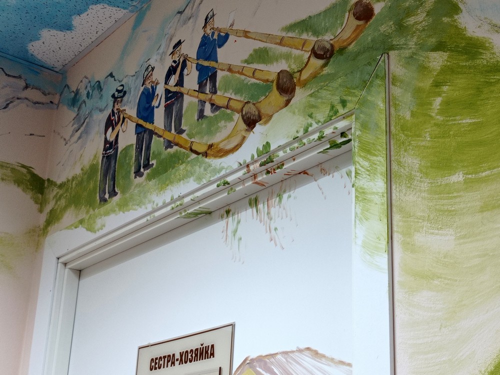 Идея панно проработана так, чтобы сюжеты выстраивались в историю, за которой интересно следить. Вход в отделение оформлен как вид из окон поезда, проезжающего альпийские луга. Поезд въезжает в горный туннель и выныривает в лето — там канатная дорога, домики, коровы с выступающими из стены головами в цветах.