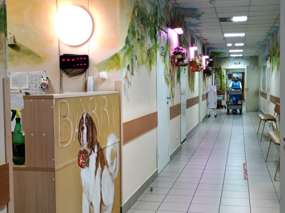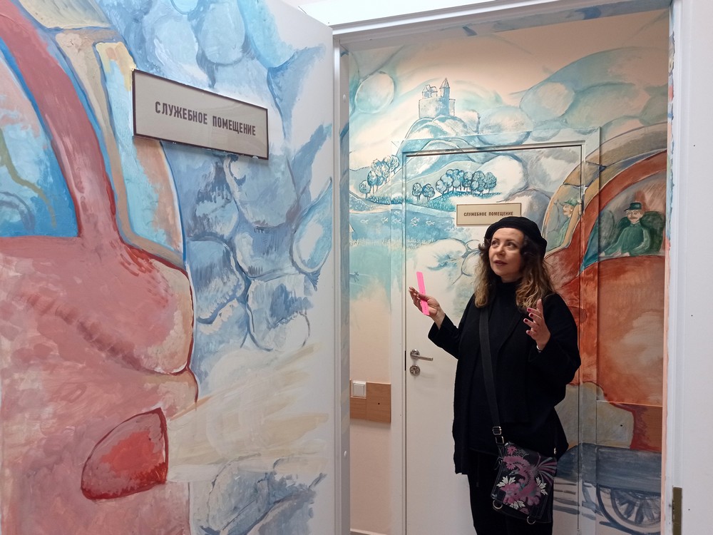 Каминская раньше преподавала зарубежную литературу в Петербургской театральной академии. Она предложила своей бывшей студентке, театральной художнице, оформить коридор отделения так, чтобы у людей, чье жизненное пространство ограничено больничными стенами, появилась мотивация двигаться и всматриваться.