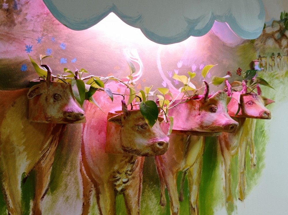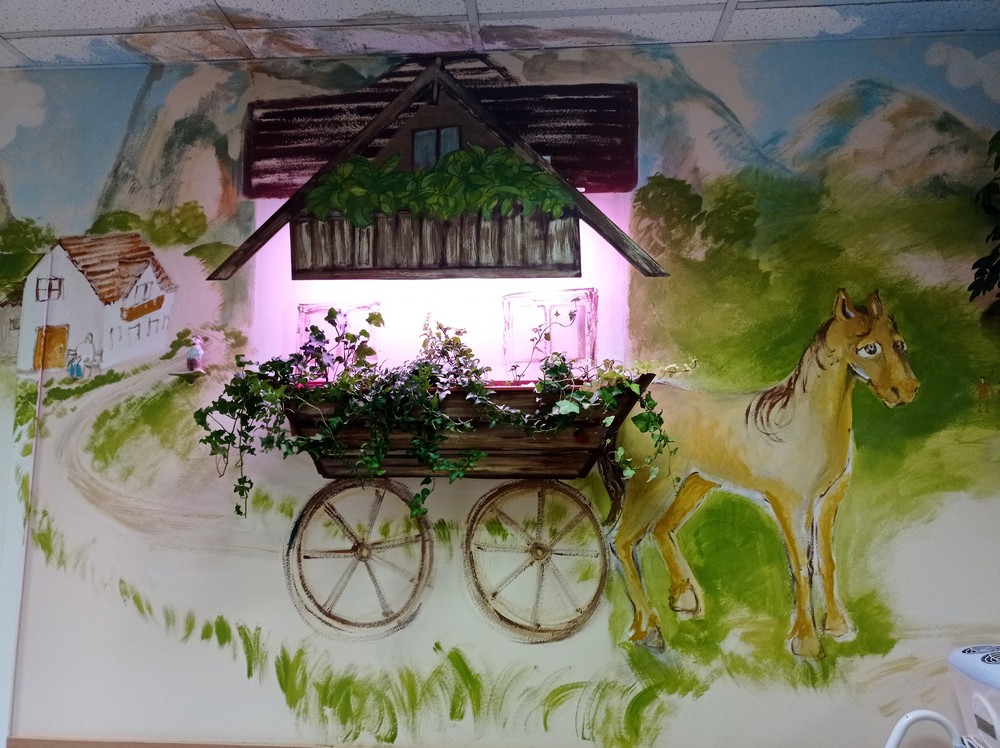 Авторы проекта решили создать огромное панно, включающее роспись, растения в керамических кашпо, подсветку и другие объемные элементы. В качестве основной темы выбрали ландшафты Швейцарии — идеальное место для восстанавливающих прогулок.