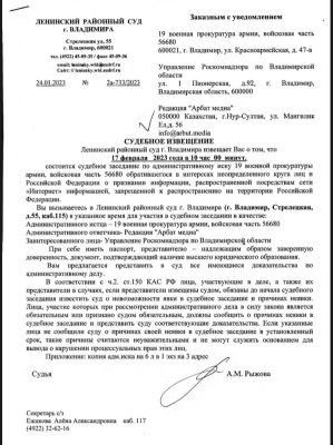 Заседание по административному иску назначили на 17 февраля. В судебном извещении, которое опубликовало Arbat.media, говорится о вызове представителей издания в суд.