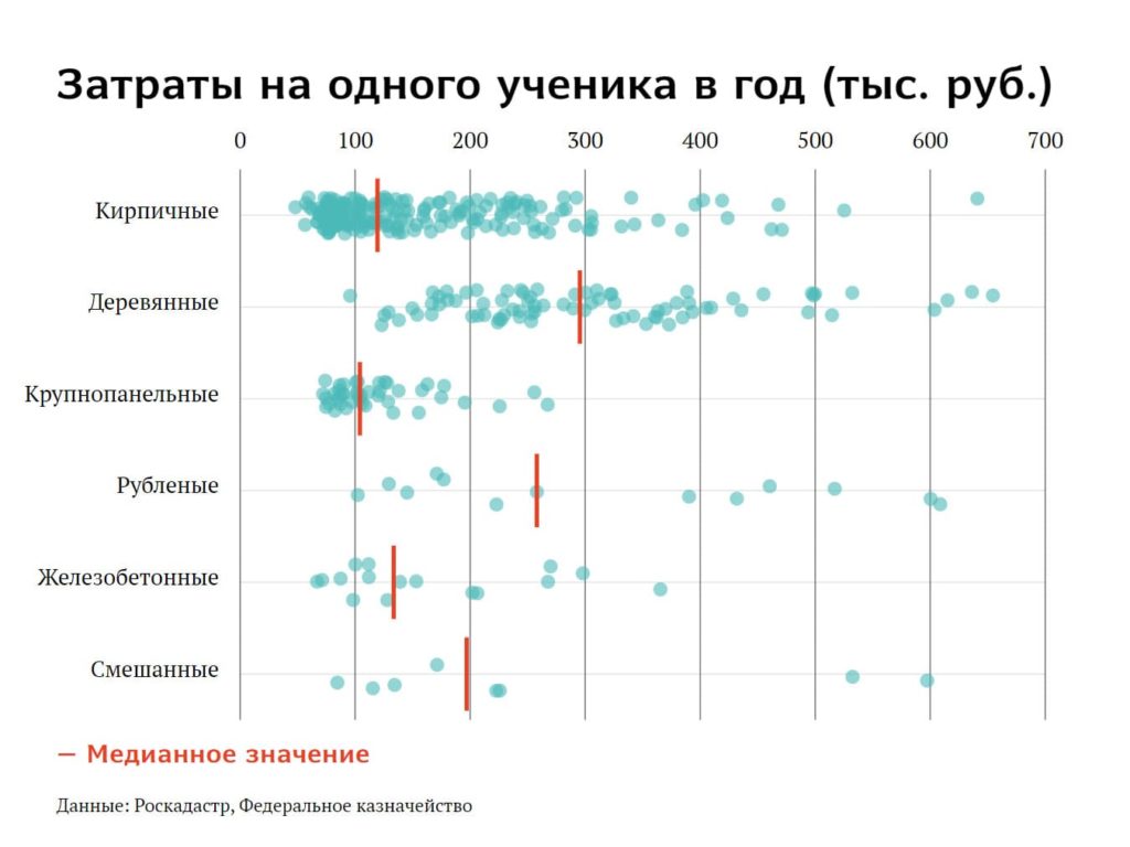 Стены ещё одного процента школ — «бетонные». Но речь, по всей видимости, идет про бетонные доски: «бетонное» формально и здание луговской школы — при этом в одном из отчётов районной администрации она называется деревянной. В некоторых других регионах школ из дерева ещё больше. Так, в Якутии, в Коми и в Тыве, судя по исследованию Высшей школы экономики, их 70%.