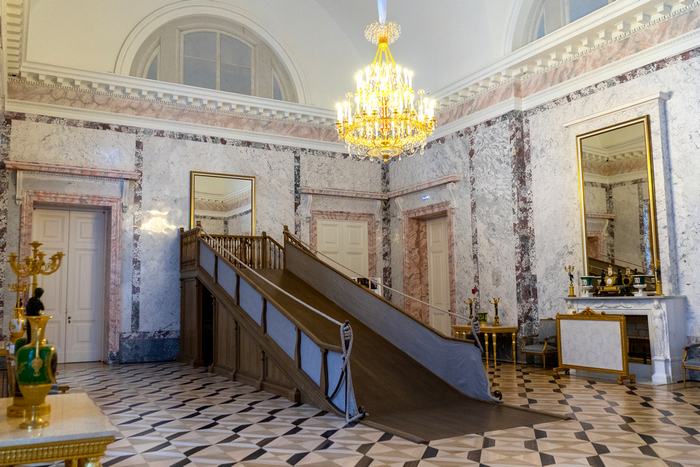 Зал с горкой реставрировали с 2019 года. Архитекторы восстанавливали интерьеры конца XVIII века, автором которых был Джакомо Кваренги. Стены зала отделаны искусственным мрамором.