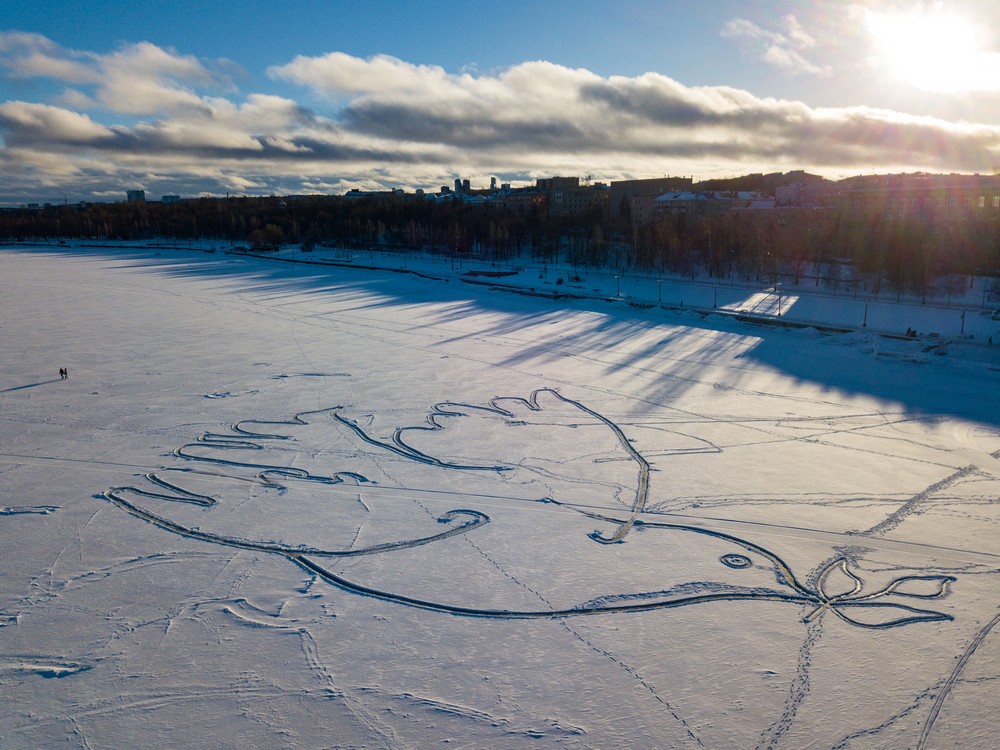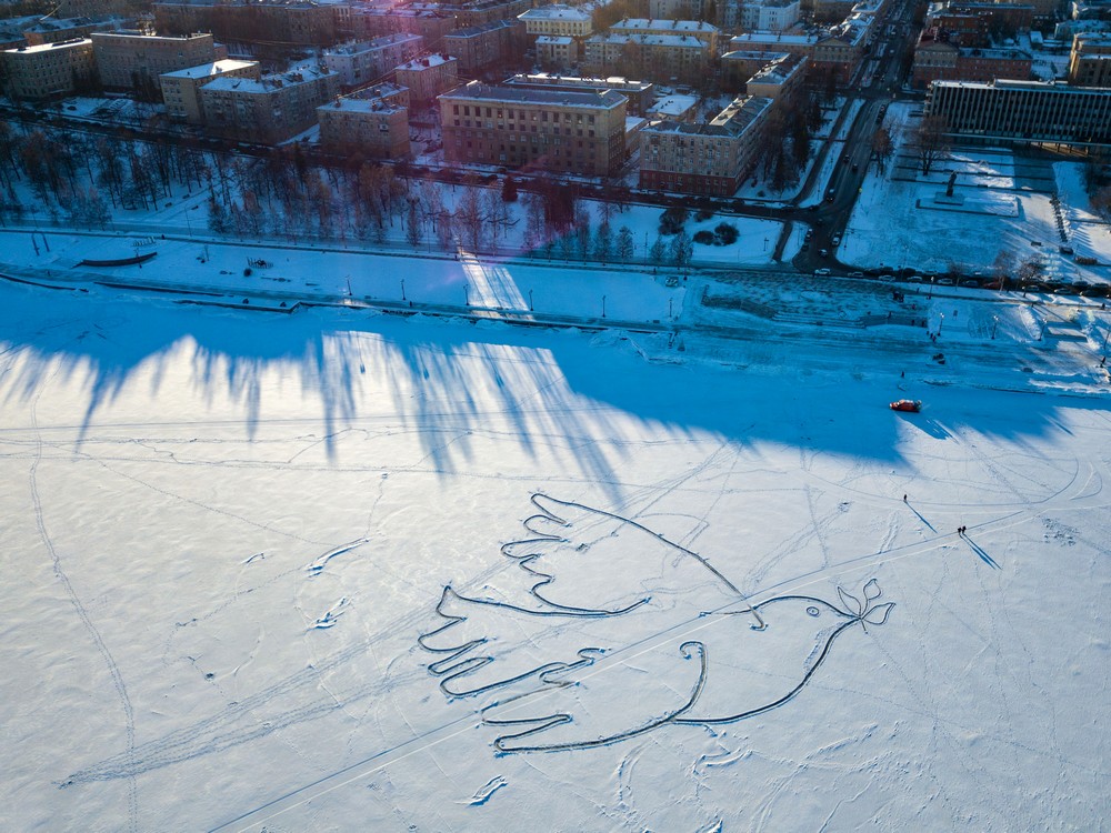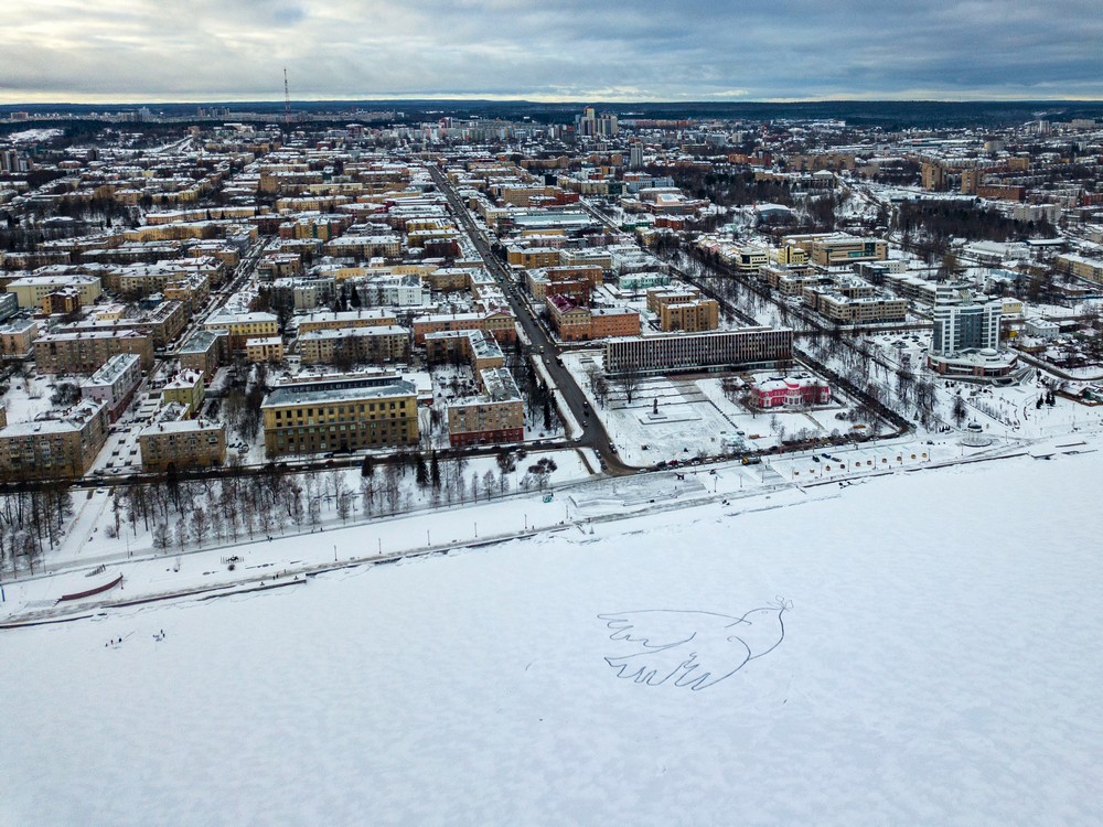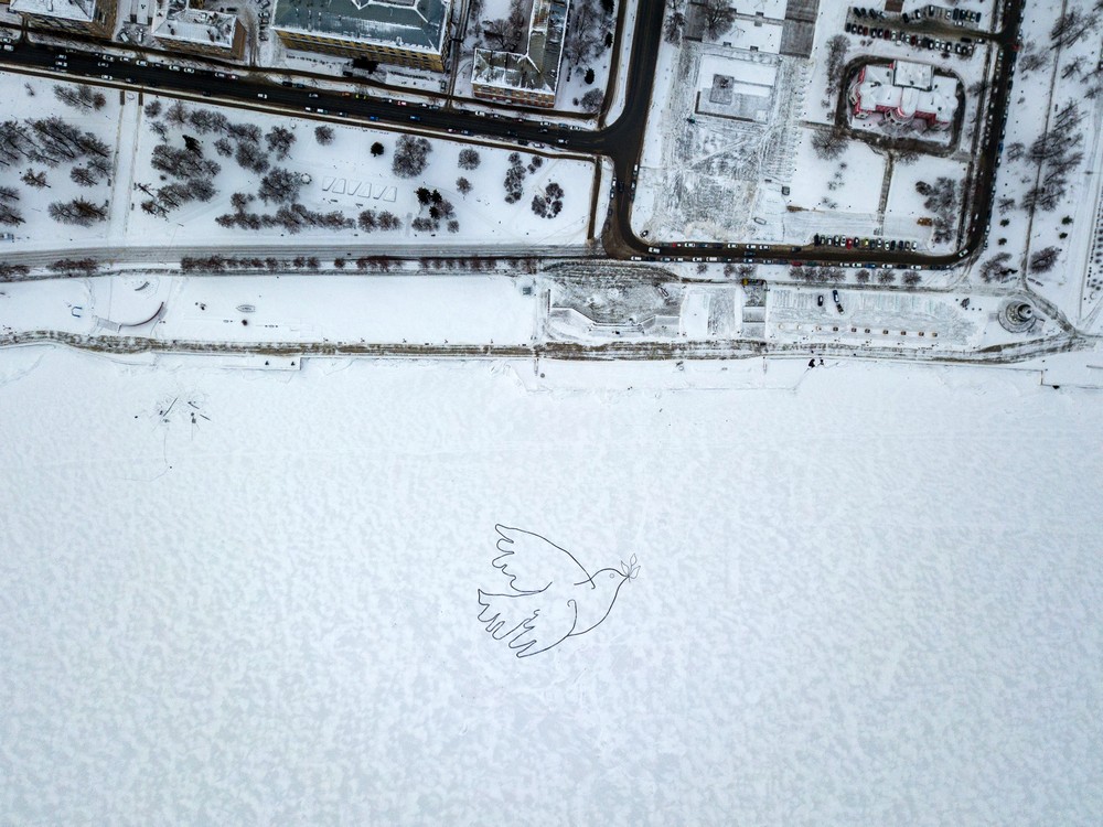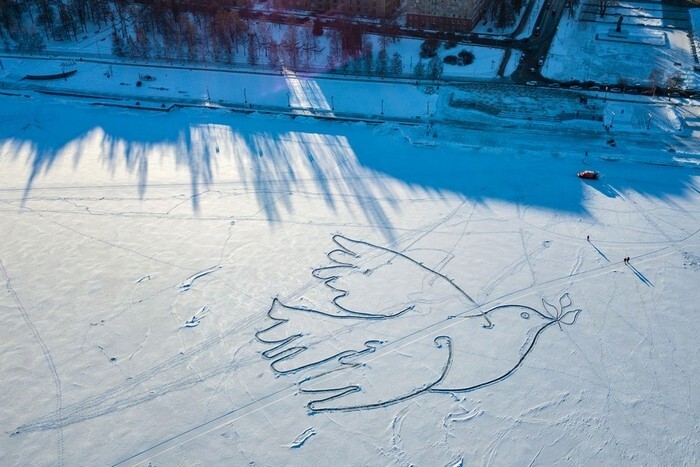 Жители Петрозаводска нарисовали лопатами на льду Онежского озера 100-метровую копию «Голубки» — белого голубя мира, созданного художником Пабло Пикассо. Фотографии, сделанные с дрона, сразу распространились в соцсетях и СМИ. Авторы изображения — местные жители Игорь Подгорный, Надя Каргинова, Алексей Фрилунд и Дмитрий Кузнецов — говорят, что создали его за час.