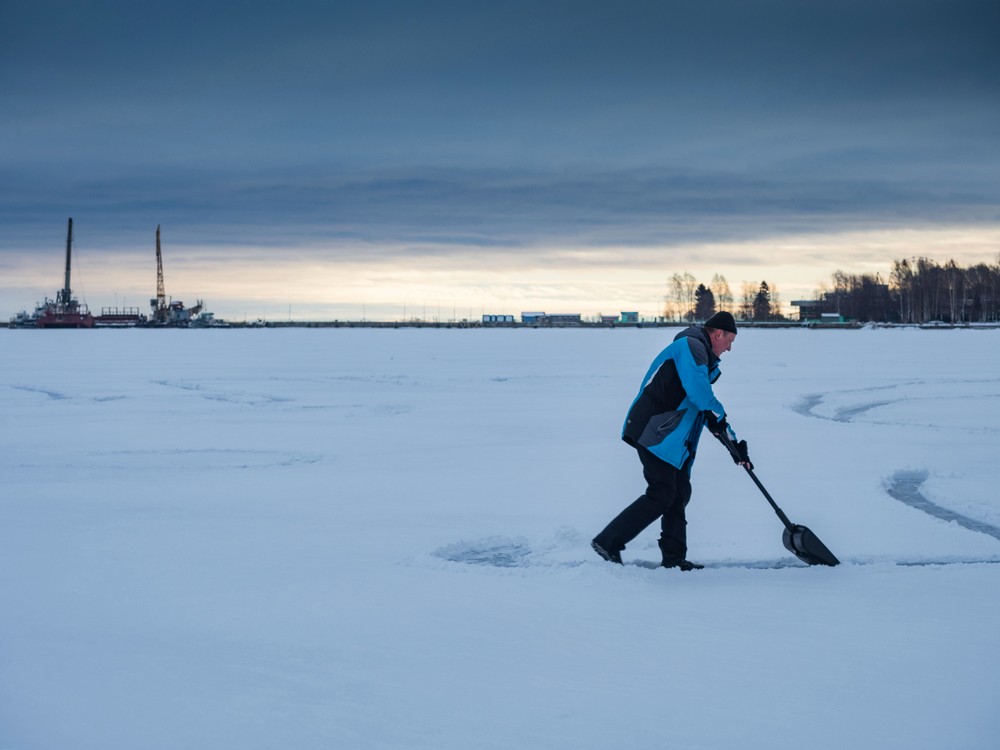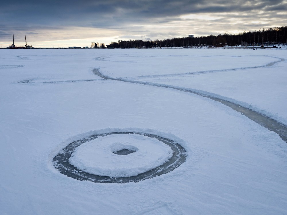 Нам нужен был лед, который только-только засыпало снегом. Угадать с нашей погодой, когда это будет, — такая себе история. Мы долго следили за прогнозом, у нас не получалось найти нужное время. 31 января мы увидели, что пошел снег, а у нас на следующий день как раз было «окошко».