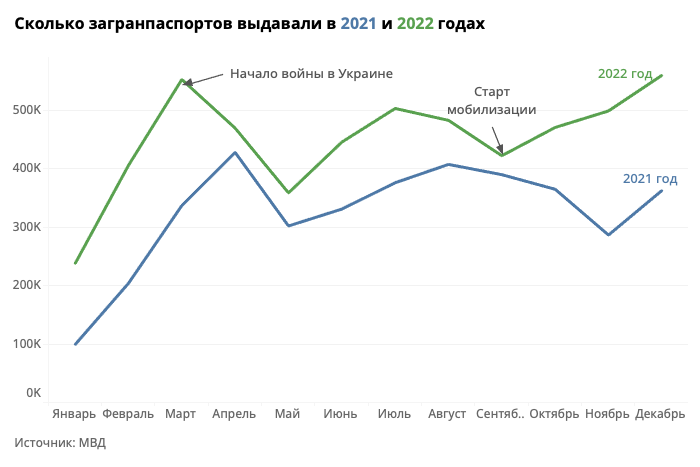 Действительно ли вырос спрос. Журналисты «Медиазоны» заметили, что радикальных изменений в запросах на оформление загранпаспортов в 2022 году не было, сославшись на статистику МВД.