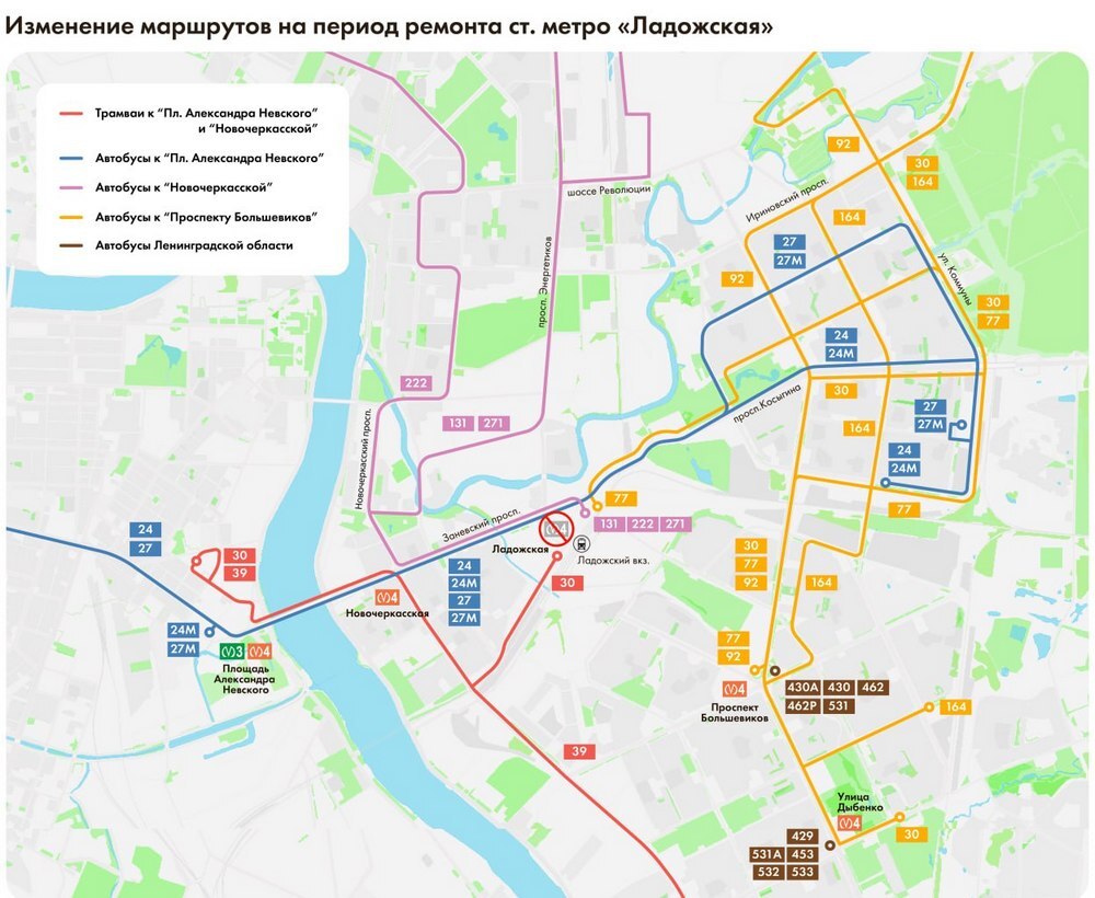 - Два дополнительных автобусных маршрута — № 24М и № 27М — будут следовать от площади Александра Невского по Заневскому проспекту до проспекта Косыгина и далее по трассам маршрутов № 24 и 27 до автобусных станций «Хасанская улица» и «Белорусская улица». Эти автобусы запустят за две недели до закрытия «Ладожской».