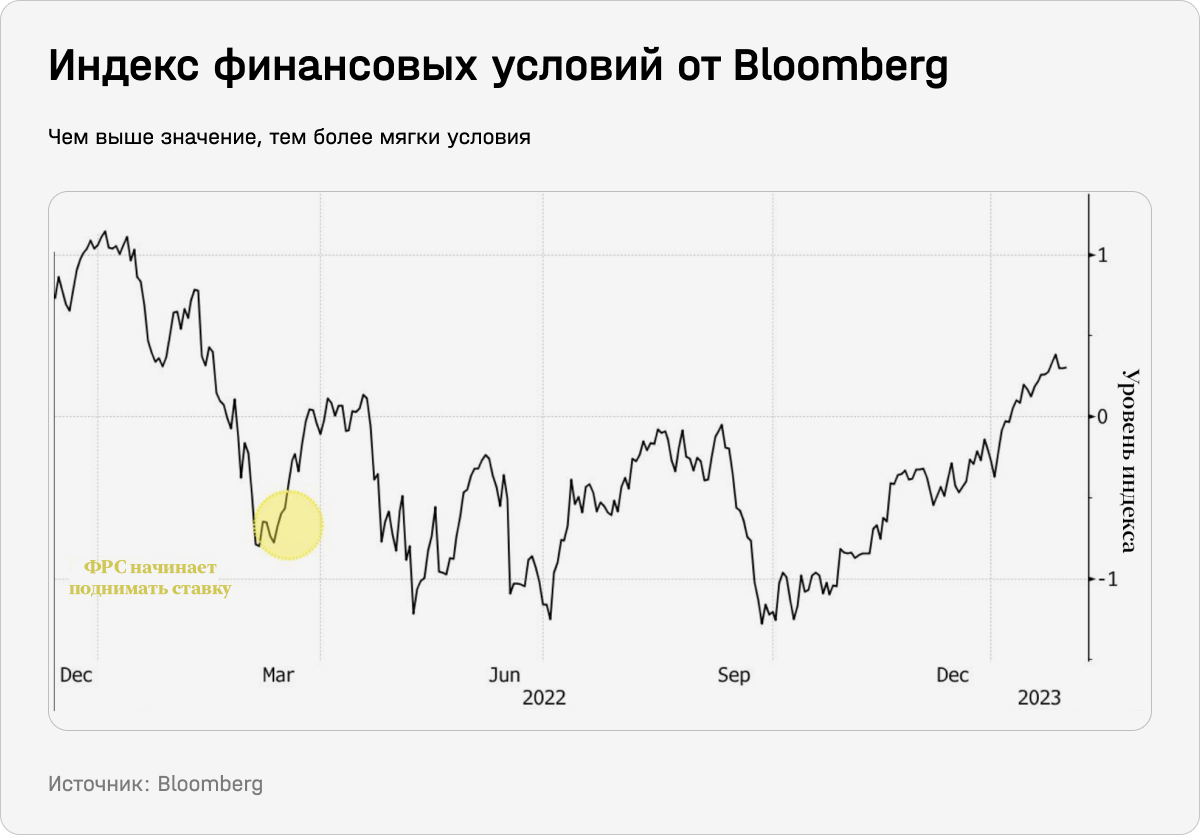 В результате финансовые условия сейчас даже мягче, чем в марте, когда ФРС начала поднимать ставки. «Минуты», опубликованные в начале января, показали обеспокоенность управляющих ФРС из-за этого. Но в среду почему-то Пауэлл ответил, что условия ужесточились, хотя это не так, отмечает старший редактор Bloomberg Джон Отерс. Таким образом, шанс послать явный ястребиный сигнал был упущен, а инвесторы приняли это как сигнал того, что ФРС не будет мешать «ралли» на рынках.