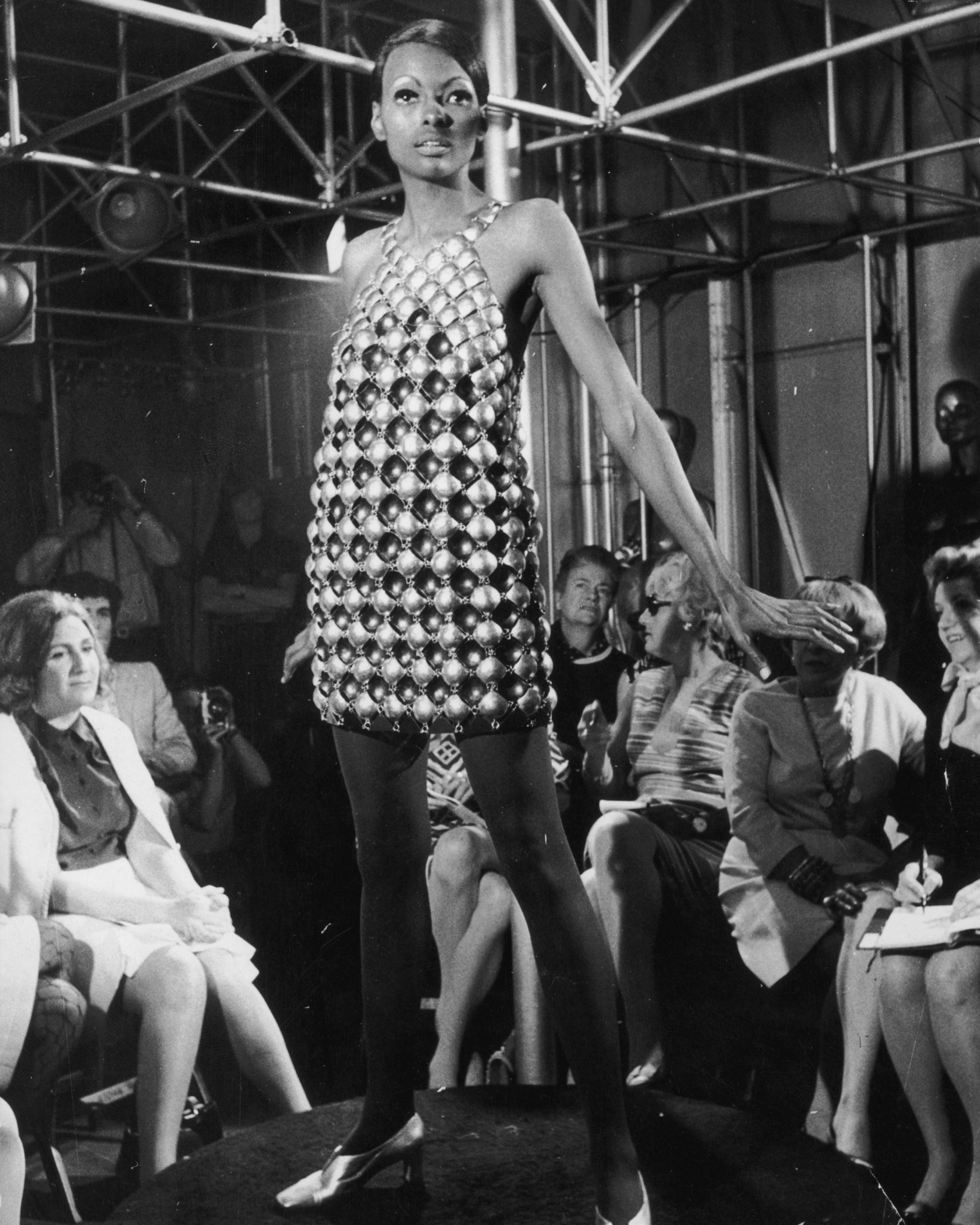 Девушки с прическами от культового стилиста по волосам Видала Сассуна дефилировали босиком в миниатюрных платьях из пластиковых и металлических элементов, скрепленных проволочными колечками (Рабан использовал вместо нитки с иголкой плоскогубцы и сравнивал традиционное шитье с формой рабства). Платья, как отметили критики, «открывали гораздо больше женского тела, чем скрывали». Впрочем, сам дизайнер говорил, что их скорее стоит рассматривать как заявления, чем как одежду. Через месяц Рабан показал коллекцию в Нью-Йорке — с гораздо большим успехом, — а спустя более 50 лет платья превратились в NFT.