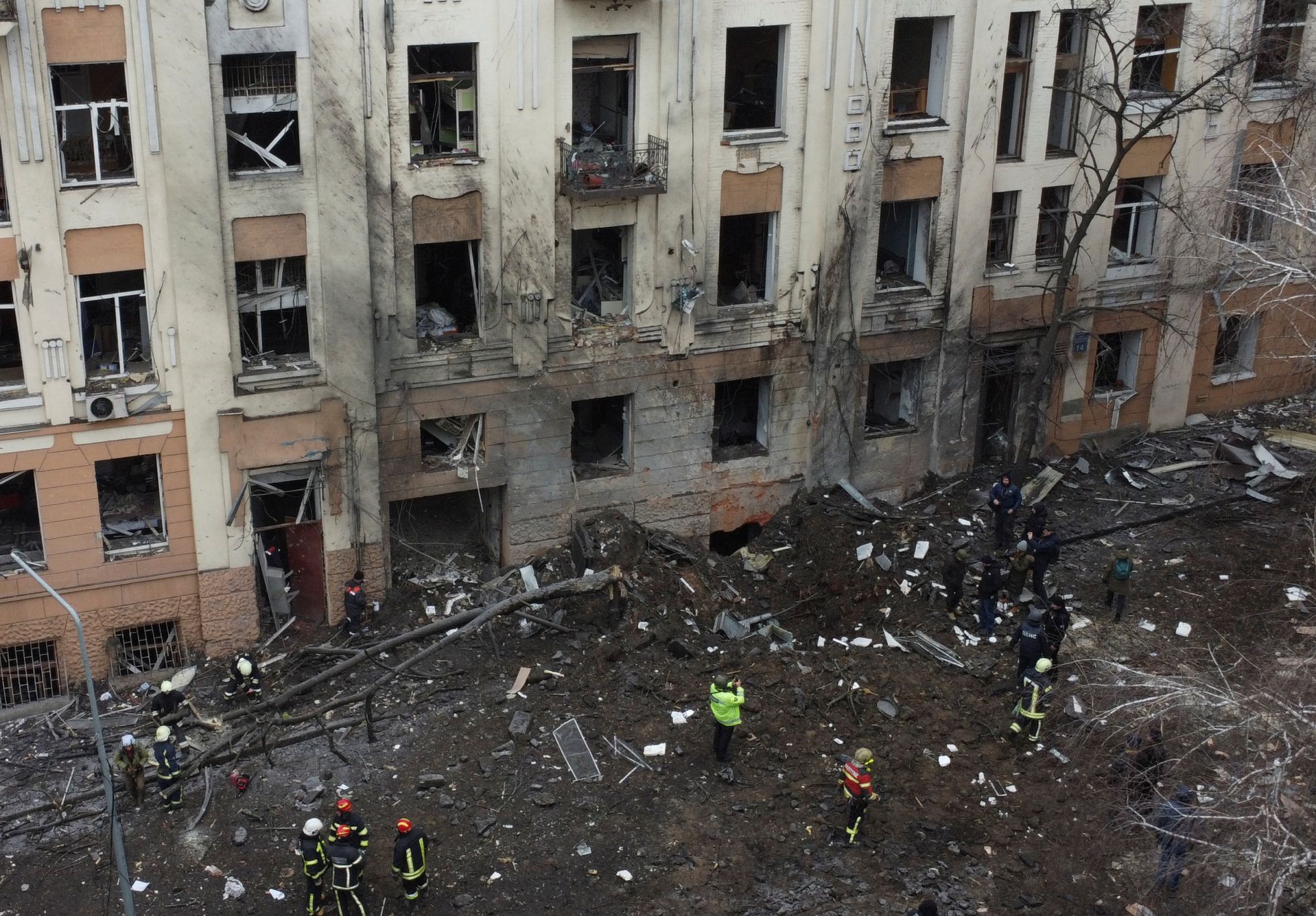 Россия ударила по центру Харькова. Одна ракета снесла верхние этажи университета, вторая попала в соседний жилой дом