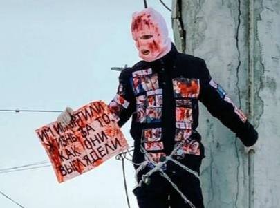 Карасев вчера, 5 февраля, забрался на столб около площади Пушкина с красным плакатом с надписью «Им испортили жизнь за то, как они выглядели». На активисте была белая балаклава, забрызганная красной краской и черный костюм с фотографиями людей, подвергшихся насилию из-за своего внешнего вида.