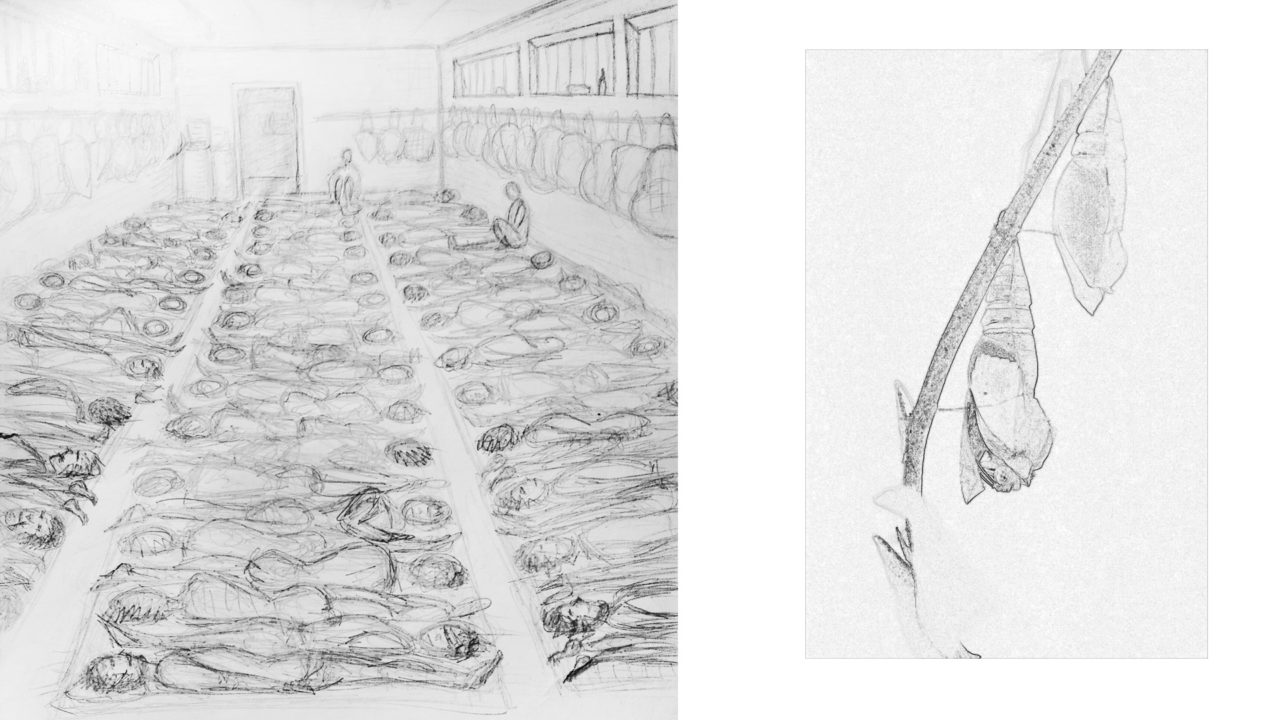 Рисунок карандашом тюремной камеры и изображение куколки бабочкиФото: коллаж из рисунка Александра и фото Bankim Desai/Unsplash — Помню, как к нам приехали двое пакистанцев. Совершенно мультяшные! — Глаза Саши загораются, а потом увлажняются. — Один, Ашраф его звали, полненький, приземистый, лицо такое — треугольное, глаза в разные стороны смотрят. Уши торчком, а нос крючком. Бармалей натуральный! А второй: лопоухий, нос картошкой и улыбка во весь рот. У них все время было хорошее настроение, а я поражался: мы же в тюрьме — как так? Но вот этим своим характером они нас здорово подбадривали.