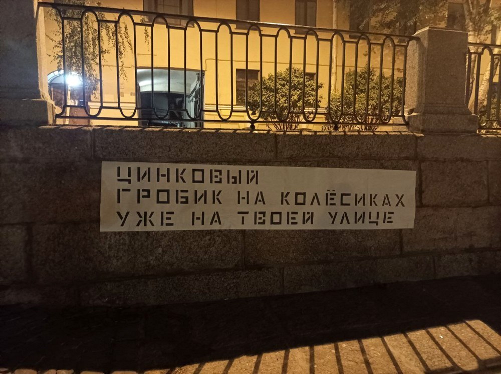 Меньше чем за год 11 петербуржцев стали фигурантами уголовных или административных дел из-за антивоенных надписей на улицах города. Помимо статьи о вандализме протестующим вменяют «дискредитацию» вооруженных сил РФ и «массовое одновременное пребывание граждан». Некоторые активисты проводят в СИЗО по девять месяцев.