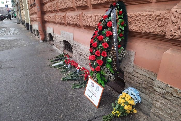 Первые цветы горожане принесли вечером 6 февраля. Сейчас у стены здания лежит несколько букетов, а на самой стене — большой венок. Фотографии опубликовал ЦЖР «Резонанс».