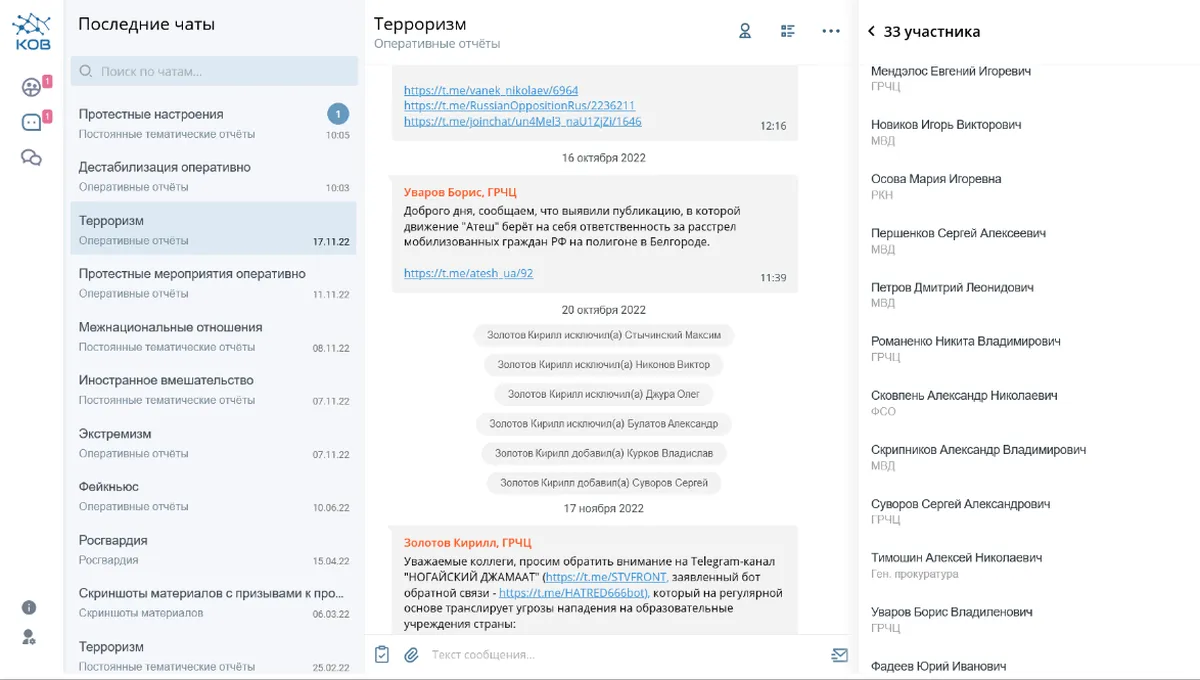 Сотрудники службы мониторинга еще как минимум с 2020 года составляют ежедневные отчеты «по дестабилизации российского общества». В системе «КОВ» даже есть отдельный чат «Дестабилизация оперативно», куда сотрудники ГРЧЦ отправляют результаты мониторинга за день со ссылками на «наиболее резонансные и/или радикальные материалы».