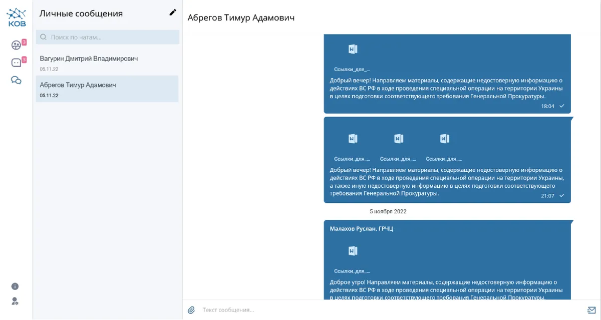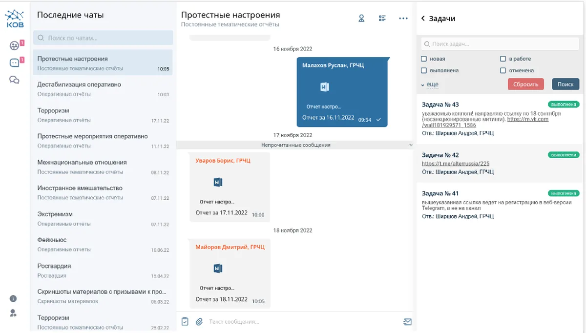 Для отправки отчетов «наверх» в ГРЧЦ используют и внутренний мессенджер — «Кабинет оперативного взаимодействия» (КОВ), который запустили в конце 2019 года. В этом мессенджере общаются сотрудники Роскомнадзора, ГРЧЦ, Генпрокуратуры, МВД и ФСБ.