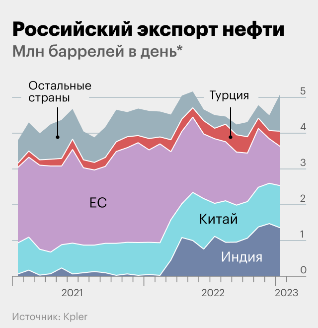 В декабре российский экспорт, который в прошлом году составлял более 10% от мирового объема торговли, и правда сильно пострадал от выпада Европы. Но всего через два месяца он вышел на уровень, который последний раз наблюдался в июне. Количество разливов нефти, которое вырастает, если рынок встает, снизилось до нормы. Как и ожидалось, Китай и Индия подбирают большую часть попавших под эмбарго баррелей. Но есть и неожиданный эффект: все больше груза уходит в неизвестном направлении. Российская нефть, за передвижениями которой раньше было так легко проследить, сегодня двигается по гораздо более мутным каналам.