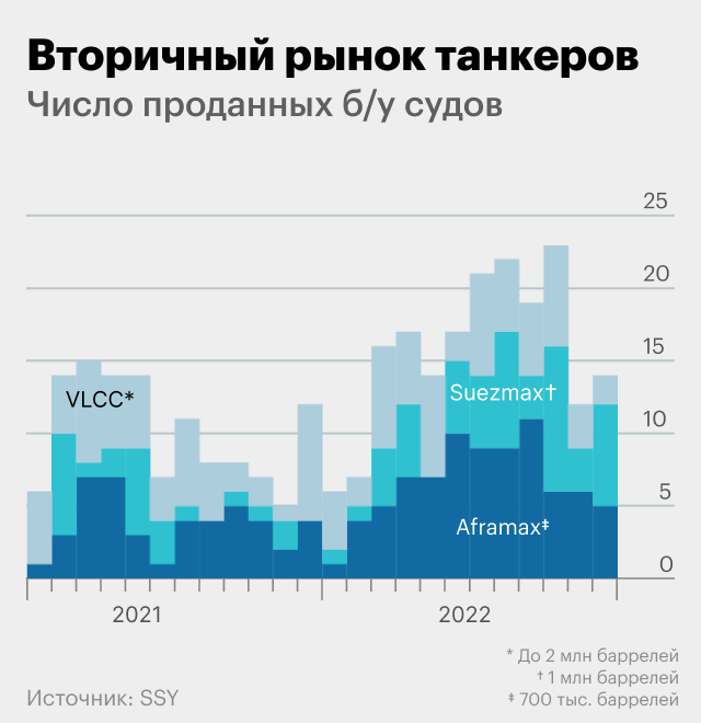 И именно эта примечательная группа контролирует разросшийся серый флот. С той секунды, как Евросоюз заговорил о логистических санкциях, рынок подержанных танкеров резко пошел в гору. За прошлый год около 200 танкеров сменили хозяев. По словам судового брокера Simpson Spence Young (SSY), это на 55% больше, чем в 2021 году. В основном это танкеры типов Aframax и Suezmax с максимальной вместимостью в 1 млн баррелей, единственные корабли, чей достаточно небольшой размер позволяет причаливать в российских портах. Спрос на Aframax вырос так сильно, что недавно несколько танкеров продали по 35 млн долларов — примерно столько Китай в прошлом году платил за гораздо большие суда, способные перевозить до 2 млн баррелей.