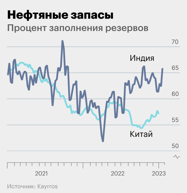 Серой торговле есть куда расти. Китай и Индия могут купить еще больше российской нефти-сырца — их резервуары заполнены менее чем на две трети, и, по мнению аналитиков из Kayrros, это значит, что нефть не хранится, а перерабатывается и перепродается, в том числе в Европу. 3 января Китай увеличил квоты на экспорт нефтепродуктов почти на 50% по сравнению с прошлым годом, отмечает Джованни Серио из торговой компании Vitol, возможно, страна готовится покупать больше российского сырца, чтобы продавать нефтепродукты за границу.