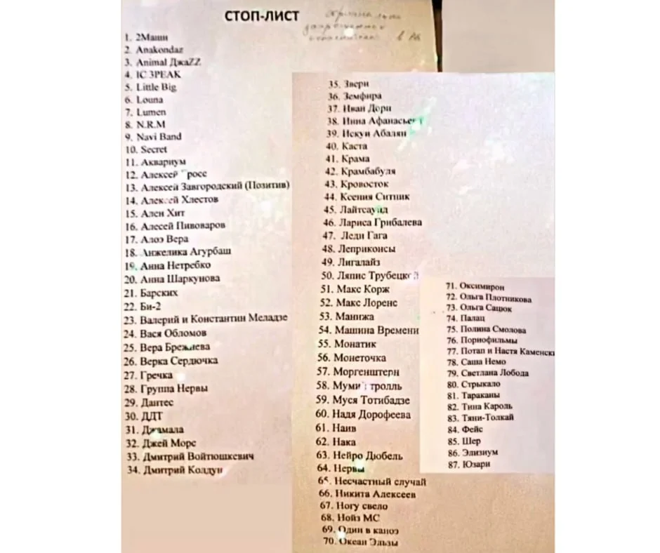Можно объяснить запрет на выступления российских групп и исполнителей, высказавшихся против войны, — от «Аквариума» до Васи Обломова, от «Ногу свело» до Оксимирона. Понятно включение украинских артистов: ну куда нынче «Океану Эльзы» в Минске выступать? Но