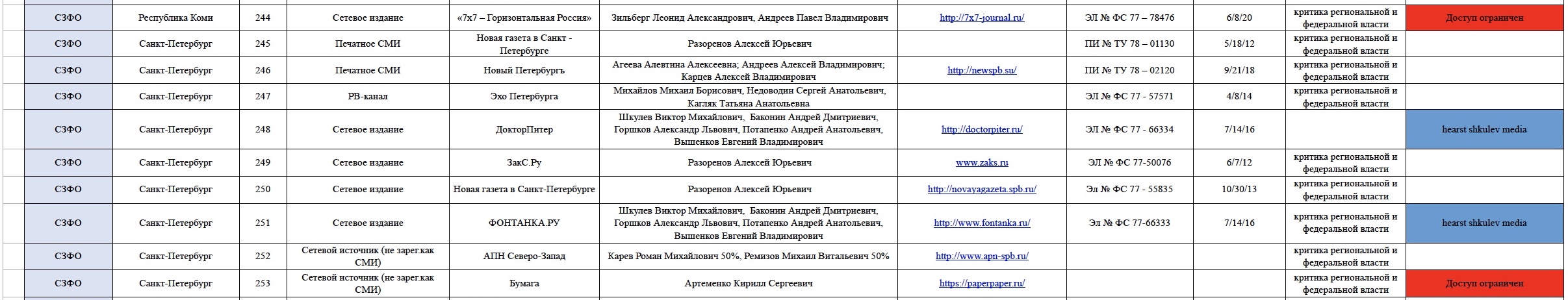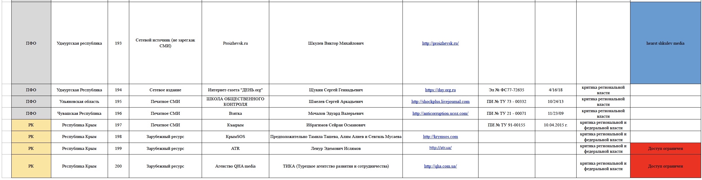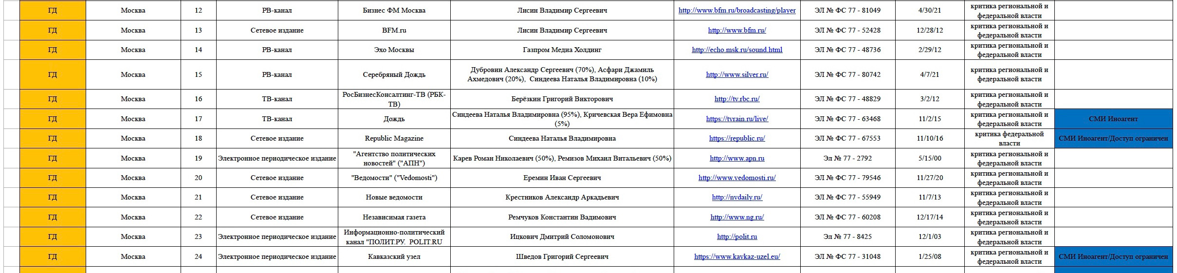 К «оппозиционным» изданиям Роскомнадзор причисляет и казалось бы достаточно лояльные медиа, например, «Ведомости», РБК и региональные издания «Московского комсомольца». Отдельно помечены 55 изданий «Шкулев Медиа Холдинга» — ведомство мониторит все издания холдинга и составляет по ним отдельные отчеты. В перечне Роскомнадзора оказался даже «Форум костромских джедаев» — местные СМИ писали, что он закрылся 16 марта 2022-го после блокировки за «недостоверную информацию» о войне в Украине.