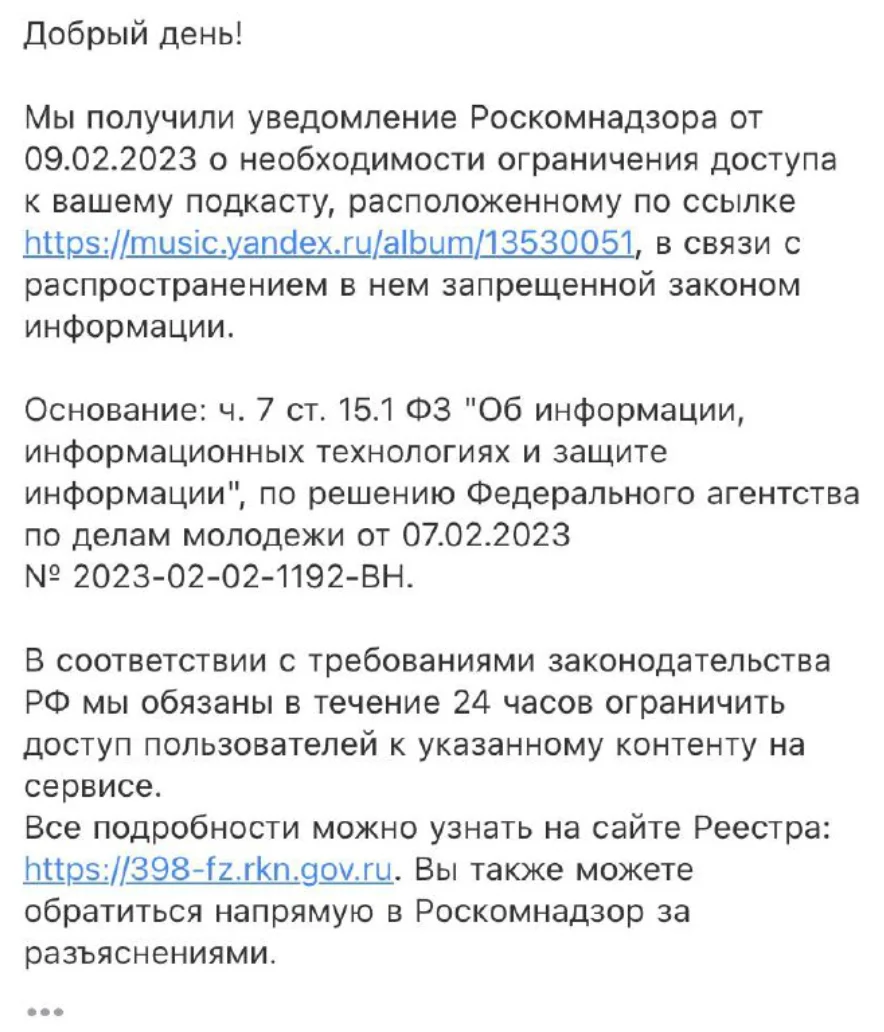 Доступ к подкасту ограничивается по требованию Роскомнадзора, говорится в письме от «Яндекса», скриншот которого опубликовала Елена.