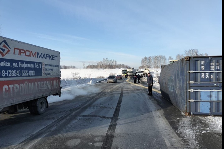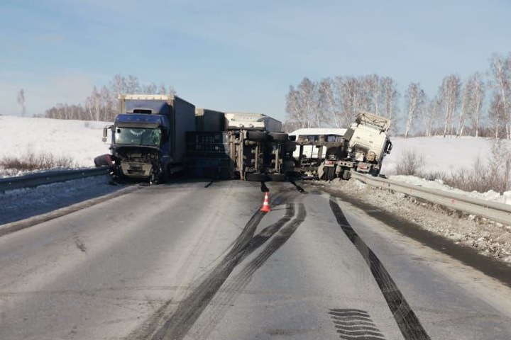 Серьезное ДТП произошло на федеральной трассе под Новосибирском. Из-за столкновения грузовиков и маршрутки образовалась огромная пробка.
