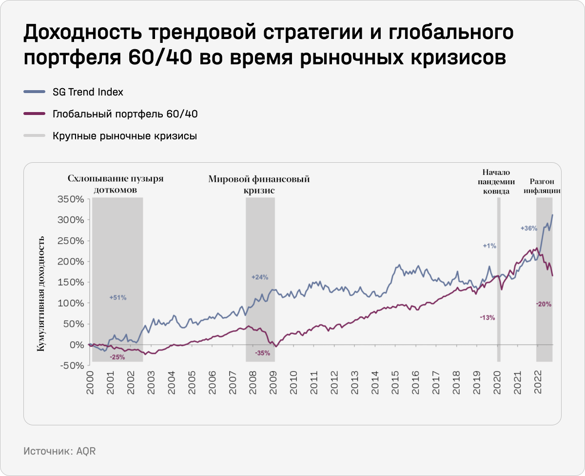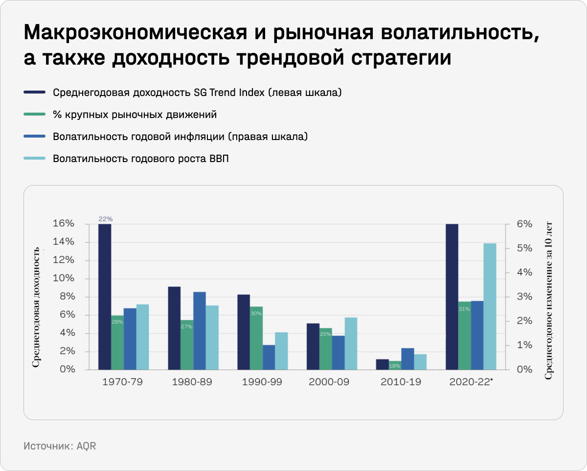Однако с 2020 года ситуация изменилась — макроэкономическая волатильность резко выросла из-за пандемии. Тогда трендовая стратегия показала рост, хотя зачастую короткие падения рынка его не приносят: например, в четвертом квартале 2018 года, когда MSCI World упал на 13,3%, SG Trend снизился на 5,1%. Теперь из-за высокой инфляции центральным банкам приходится резко менять денежно-кредитную политику (ФРС уже поднял ставки до уровня сентября 2007-го), что с большой вероятностью может вызвать рецессию в США. Как считают в AQR, макроэкономическая и рыночная волатильность, вероятно, сохранится как минимум в ближайший год-два. И именно тогда тренд снова становится другом инвестора.
