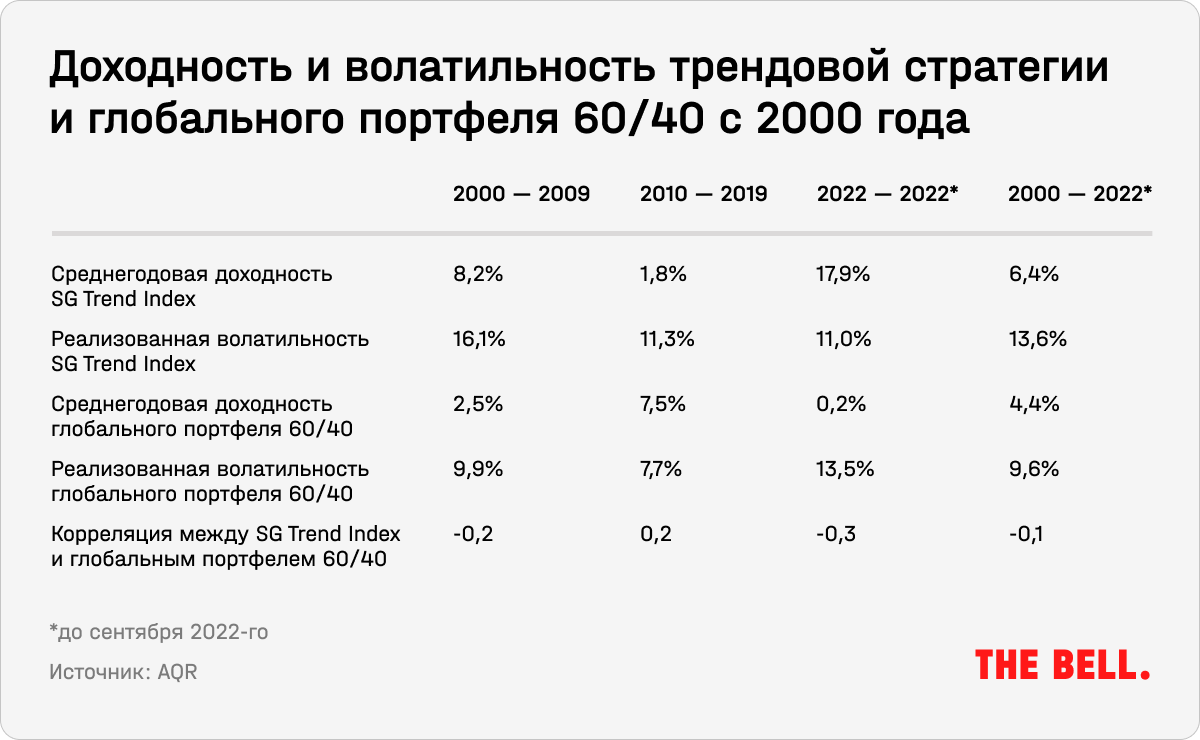 В 2022 году эта трендовая стратегия могла принести инвесторам высокий доход, даже несмотря на общее падение рынков, поэтому ее снова стали активно обсуждать. Наиболее популярный индекс такой стратегии от Societe Generale (SG Trend Index) в 2022 году вырос на 26%, в то время как глобальный портфель 60/40 (60% MSCI World, 40% Barclays Global Aggregate Hedged USD) упал на 16,2% по подсчетам The Bell. SG Trend — главный бенчмарк этой стратегии, но не единственный: аналогичные индексы рассчитывают другие инвестбанки, в том числе Barclays и Deutsche Bank.
