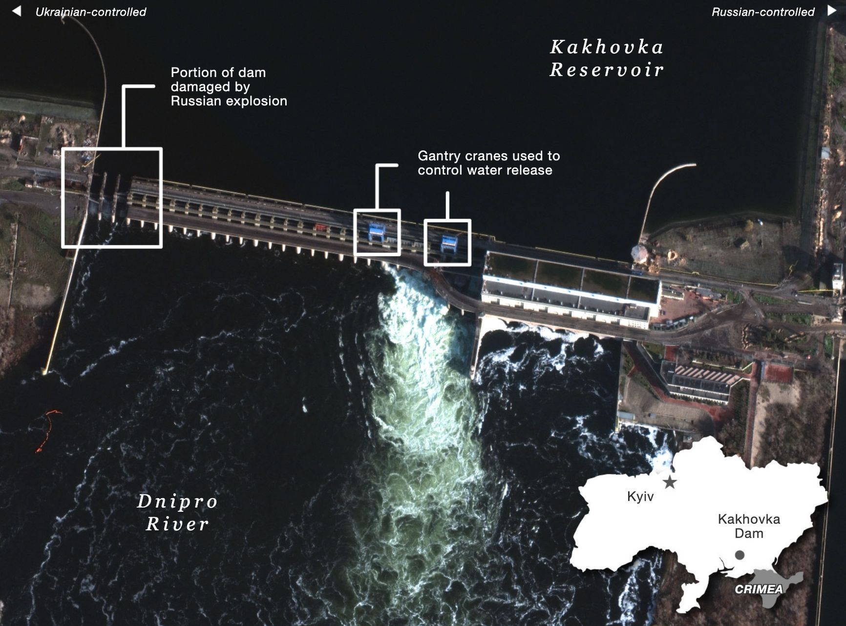 В «Укргидроэнерго» заявили, что сброс осуществляется Россией преднамеренно. Издание NPR отмечает, что сброс не является последствием подрыва полотна на плотине, шлюзы были открыты позже — это видно, если сравнивать спутниковые снимки начала февраля 2023 года и ноября 2022 года, когда был осуществлен подрыв.