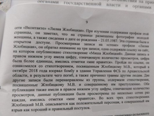 В частности, женщине вменяют публикацию на своей странице во «ВКонтакте» ссылки на сайт stihi.ru, на котором размещено стихотворение про «взрыв в помещении тайной полиции». В обвинительном заключении также упоминаются два репоста из группы «Народная Самооборона» с фотографиями Михаила Жлобицкого и текстами про взрыв в архангельском УФСБ.