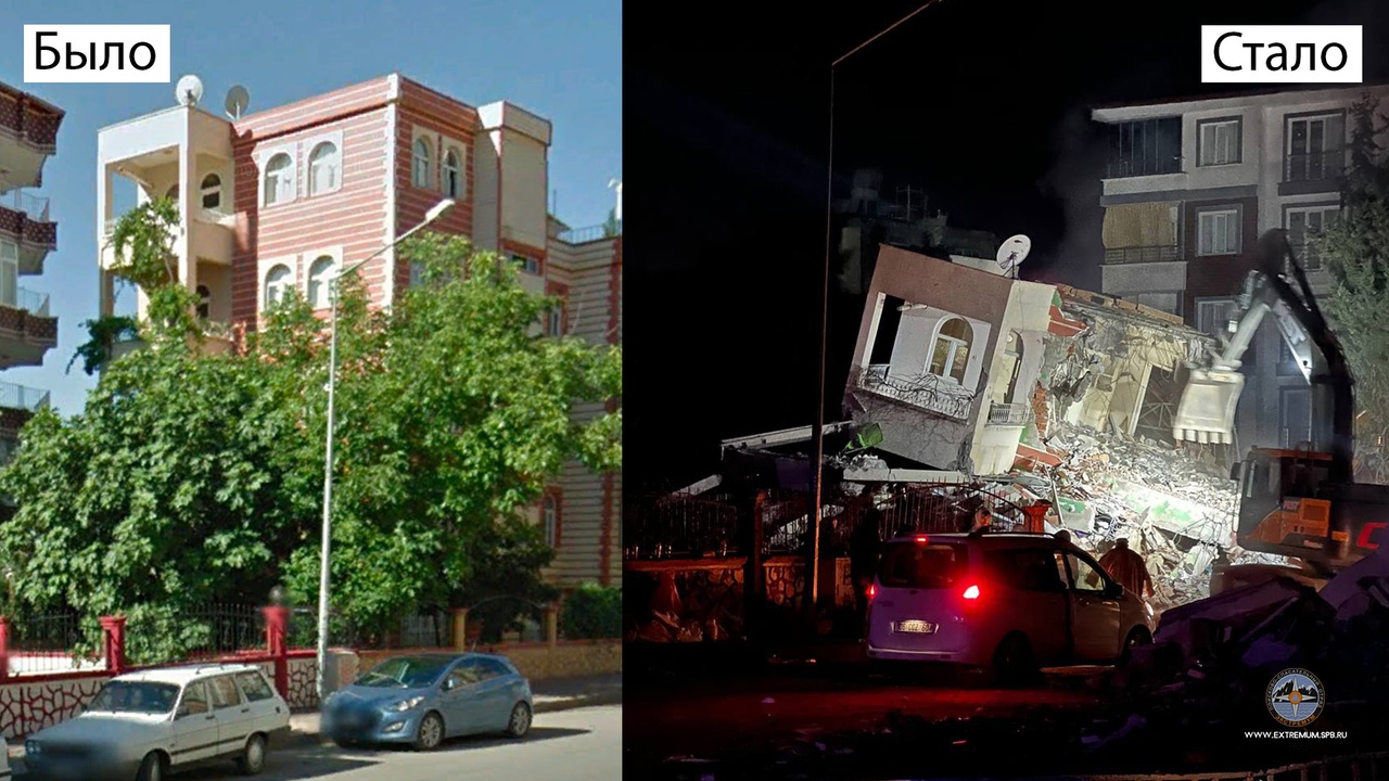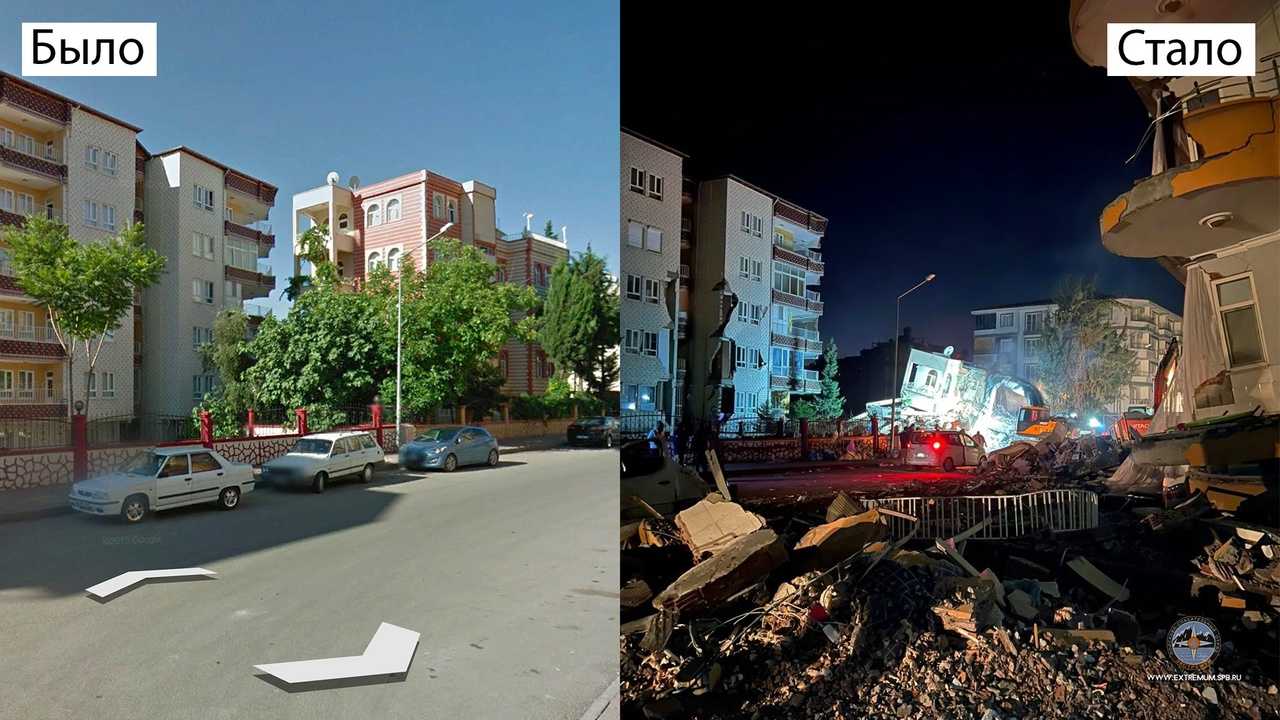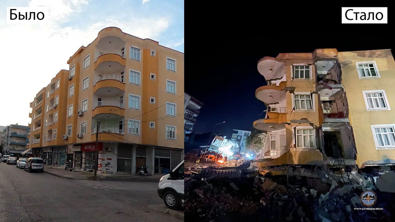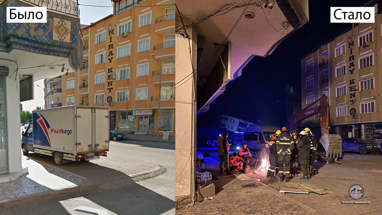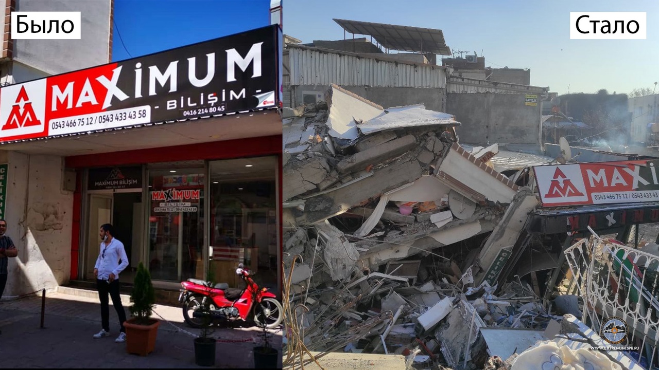Спасатели «Экстремума» также показали, как здания в городе выглядели до и после землетрясения.