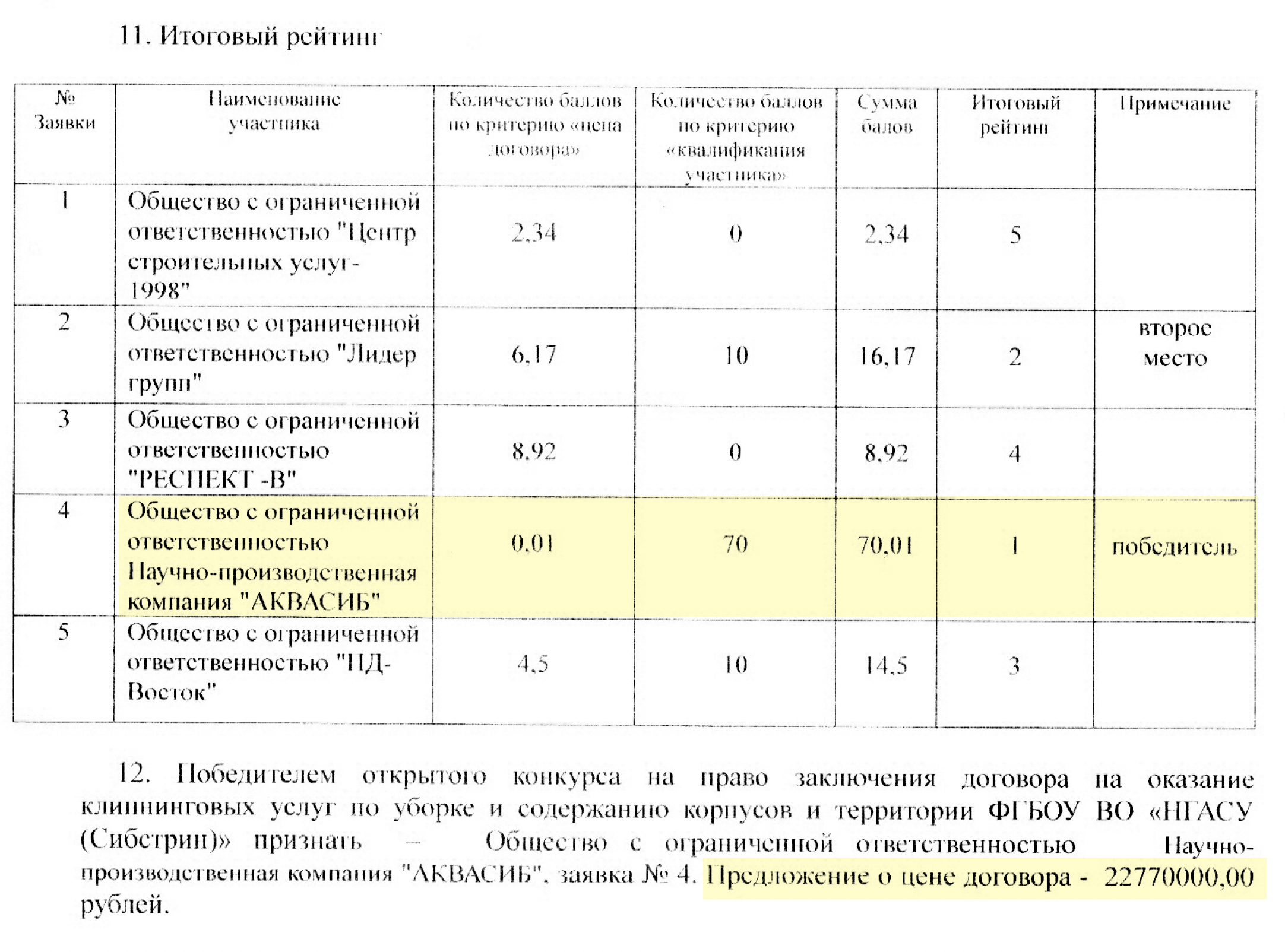 На конкурс подались пять компаний, каждая из них предложила свою цену, причем ООО «Аквасиб» — самую высокую, максимальную: