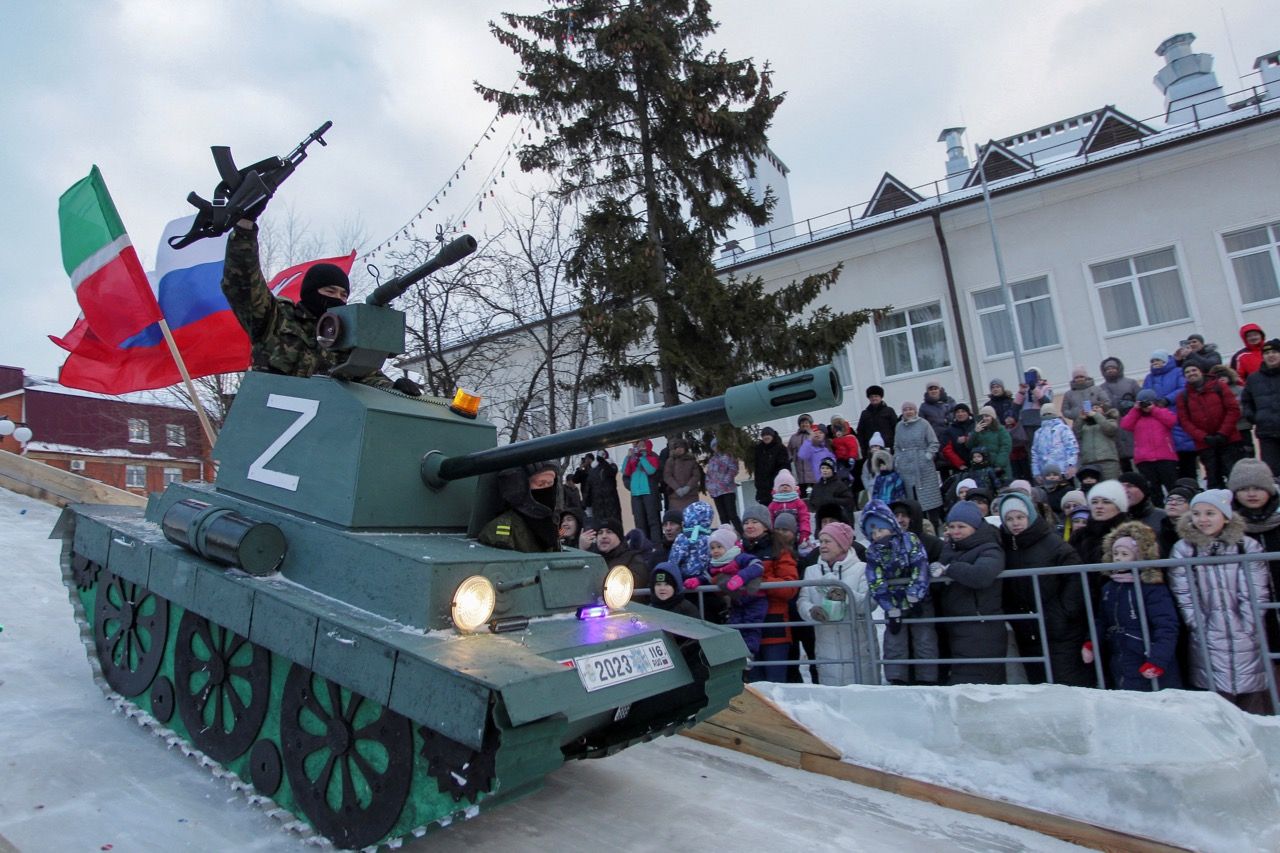Одна из команд прокатилась на санях в виде танка с символом российского вторжения в Украину — буквой Z. «Экипаж» саней переоделся в военную форму, а на сам «танк» установили флаги РФ и Татарстана.