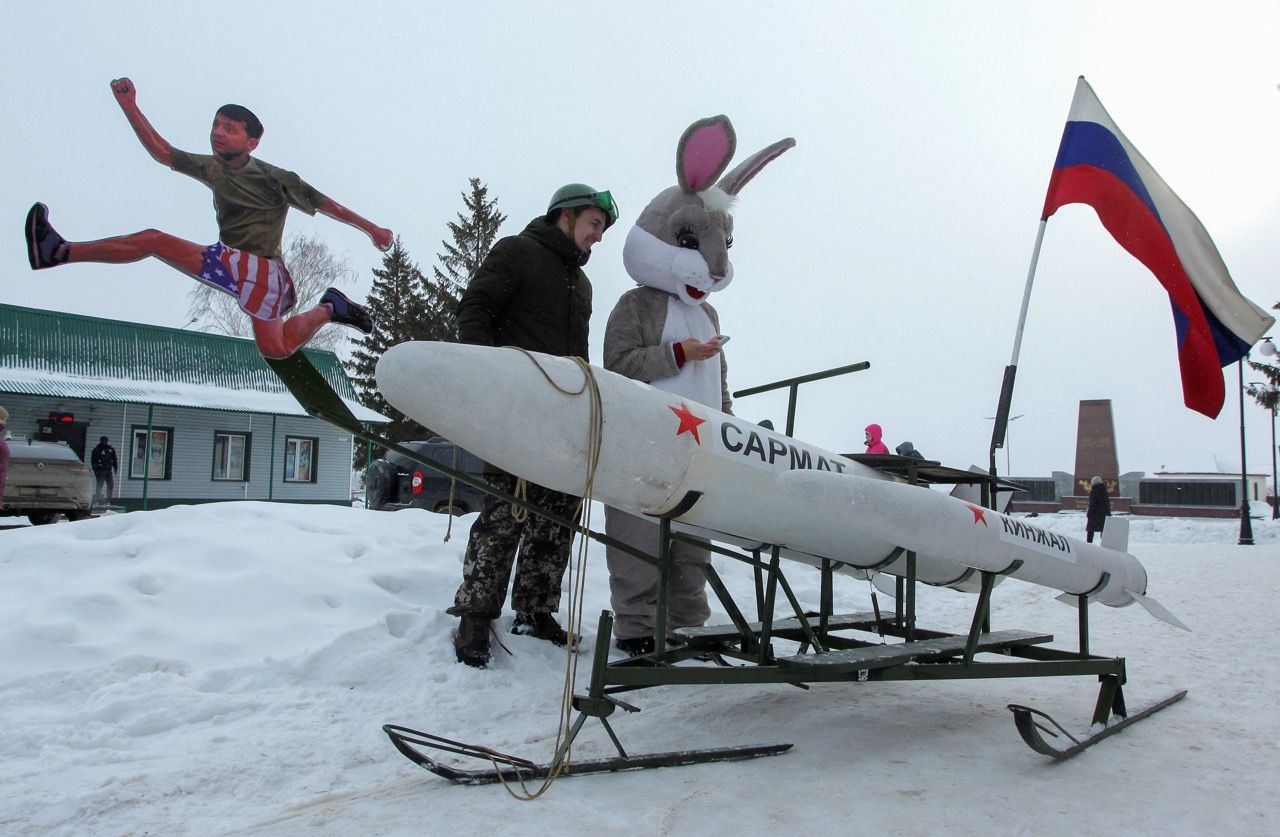 Другая команда сделала сани в виде ракеты «Сармат», от которой бежит президент Украины Владимир Зеленский в шортах в цветах флага США.