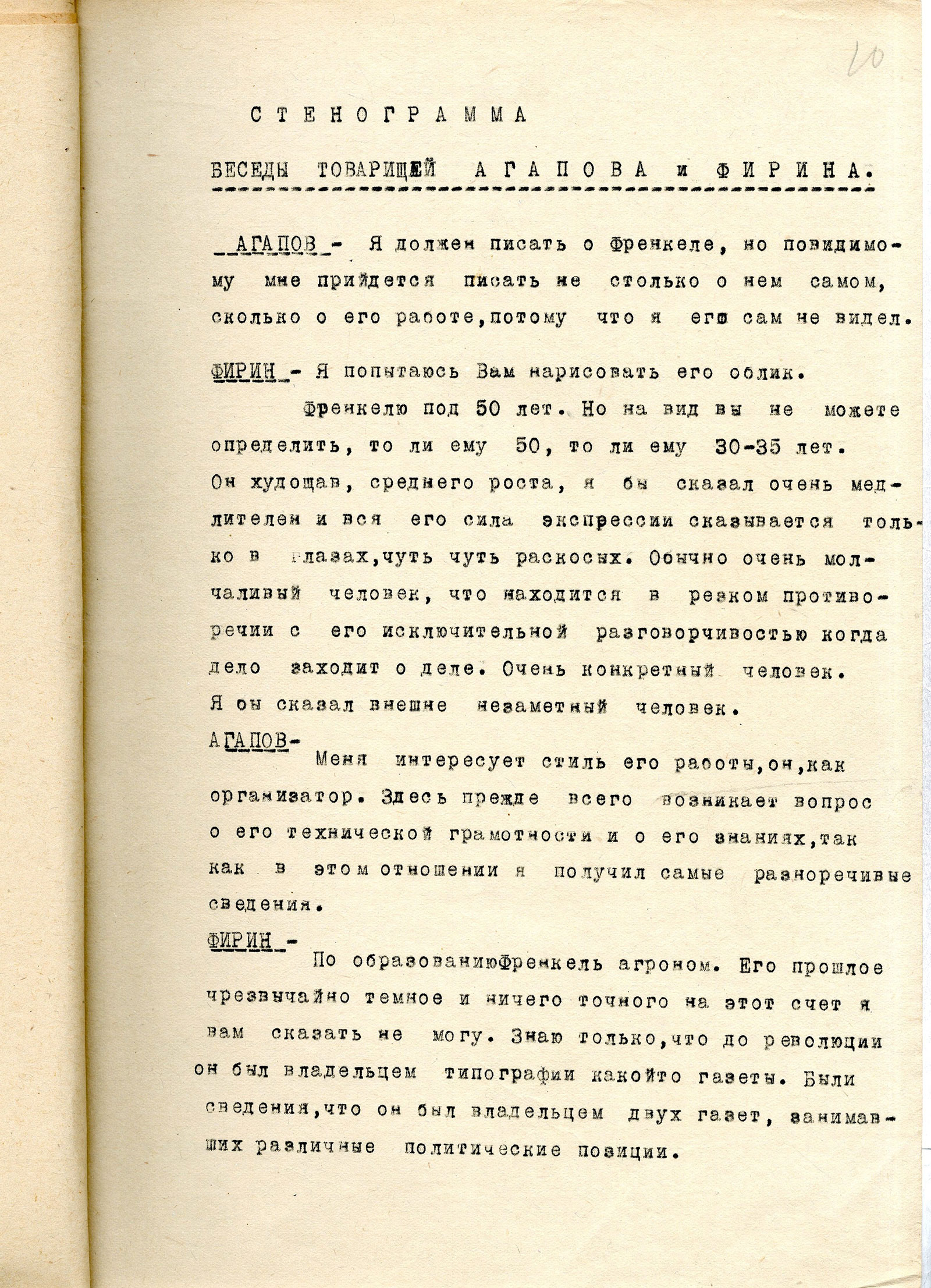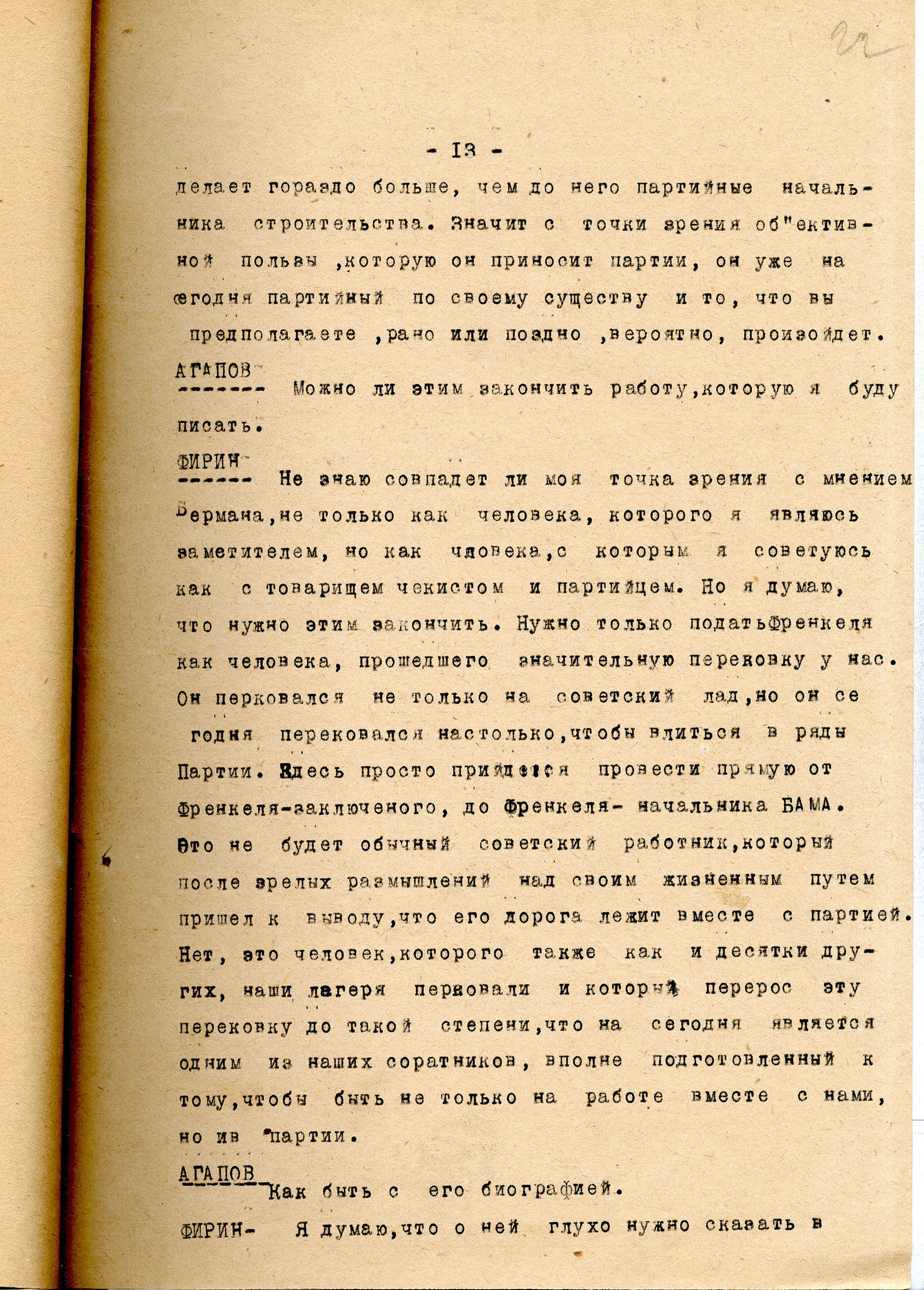 Такую же работу по созданию образа Френкеля должны были проделать и авторы коллективной монографии о Беломорканале. Френкель был начальником работ на строительстве канала, то есть одной из центральных фигур, без которой книга о возведении под руководством ОГПУ важнейшего инфраструктурного объекта в кратчайшие сроки теряла важный композиционный элемент. При этом, как видно из содержания хранящейся в ГА РФ стенограммы, Борис Агапов, которому было поручено писать о Френкеле, не мог встретиться со своим героем. К тому времени Френкель, награжденный за Беломорканал орденом Ленина, уже стал начальником строительства Байкало-Амурской магистрали (также возводившейся до войны силами заключенных) и уехал в Восточную Сибирь. Поэтому о Френкеле приходится рассказывать бывшему начальнику БелБалтЛага и заместителю начальника ГУЛАГа Семену Фирину. Фирин (Пупко), родившийся в 1898 году в семье еврейского торговца из Вильно и согласно своей официальной биографии окончивший два класса реального училища, с начала 1920-х работал агентом советской армейской разведки в разных странах Европы (утверждается, что он самостоятельно освоил шесть европейских языков и получил звание оперативного переводчика по немецкому и французскому языкам), а позже возглавлял особый отдел ОГПУ. Переход в администраторы ГУЛАГа в этом отношении выглядит как несколько неожиданный поворот карьеры. Учитывая курирование и редакторскую работу над книгой о Беломорканале, он обладал творческими амбициями, которые частично реализовывал и в изложении характеристики Френкеля для Агапова.