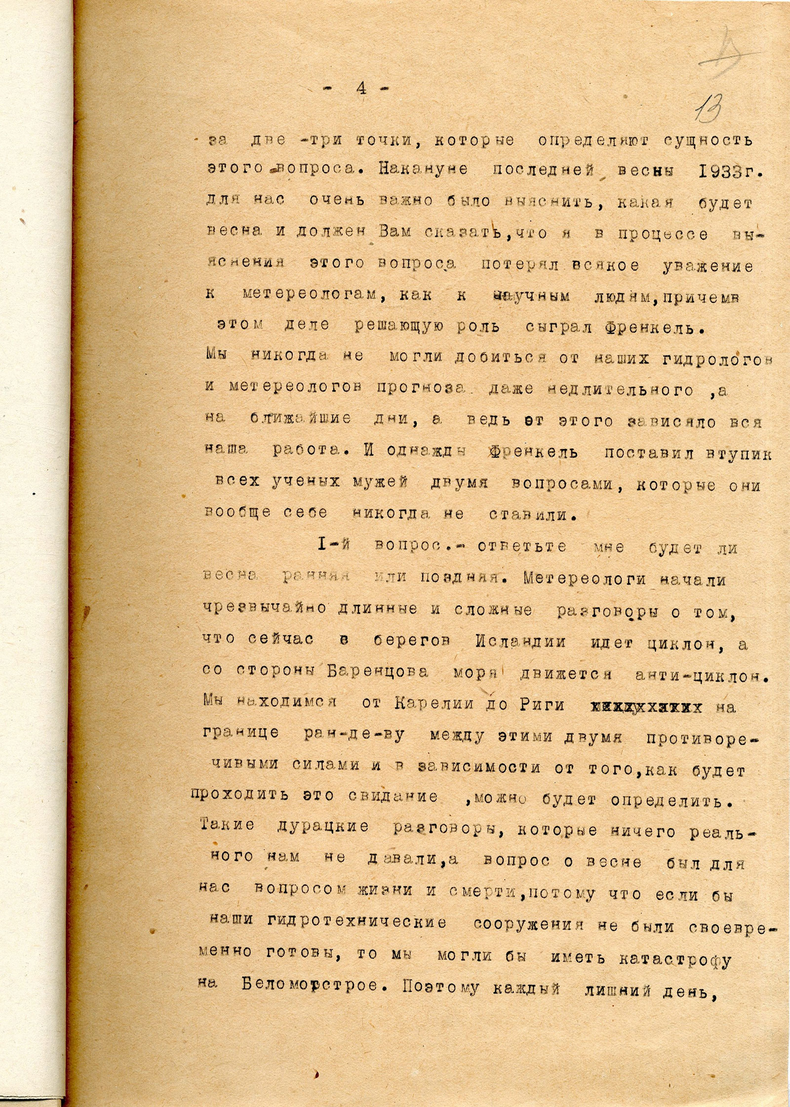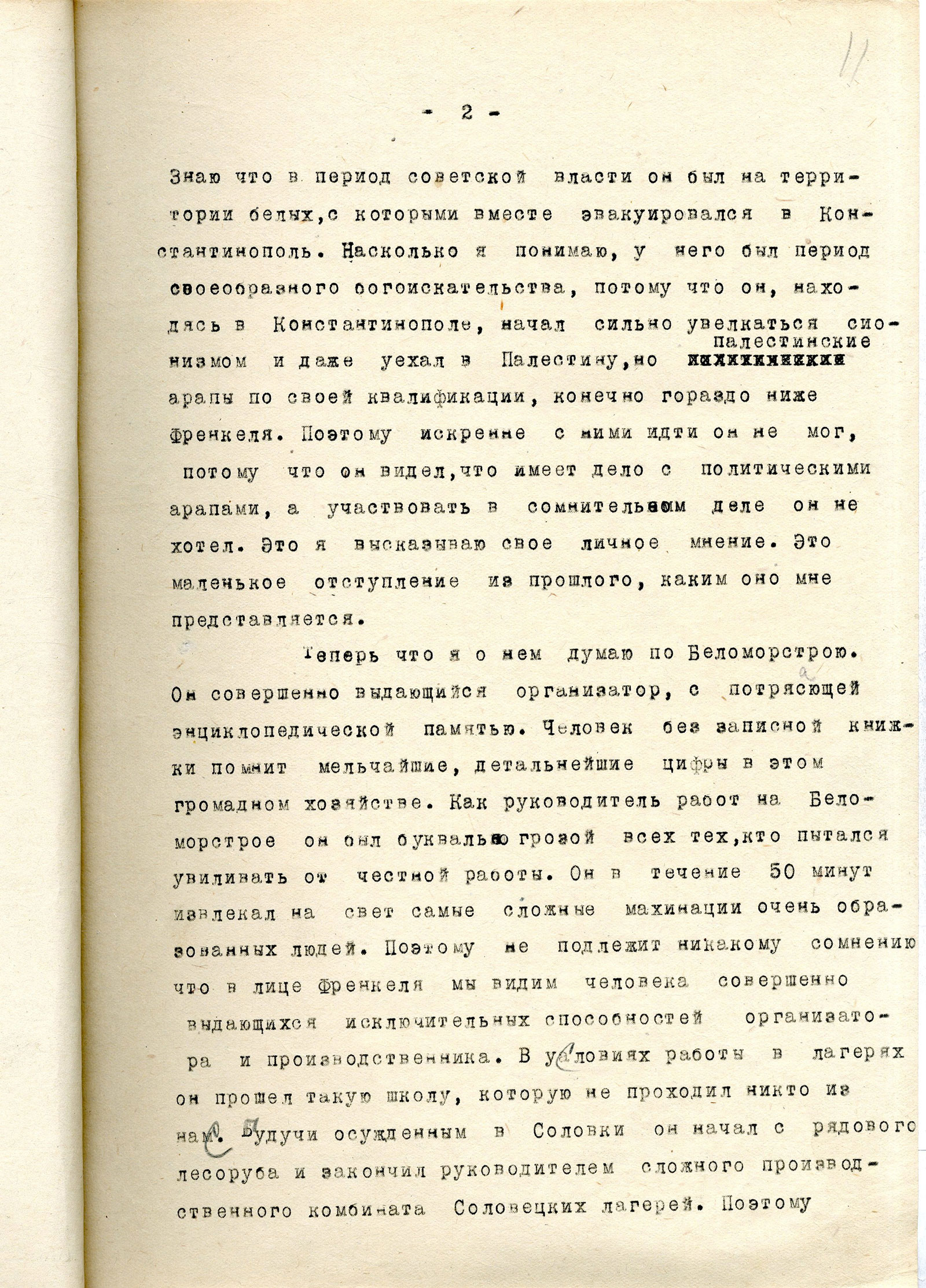 Одновременно Фирин утвердительно отвечает на вопрос Агапова, взялся бы Френкель столь же дотошно руководить проектом, не связанным с социалистическим строительством, а просто получив заказ от какой-нибудь капиталистической фирмы. «Он организатор в чистом виде. Это не есть большевик-организатор», — говорит Фирин.