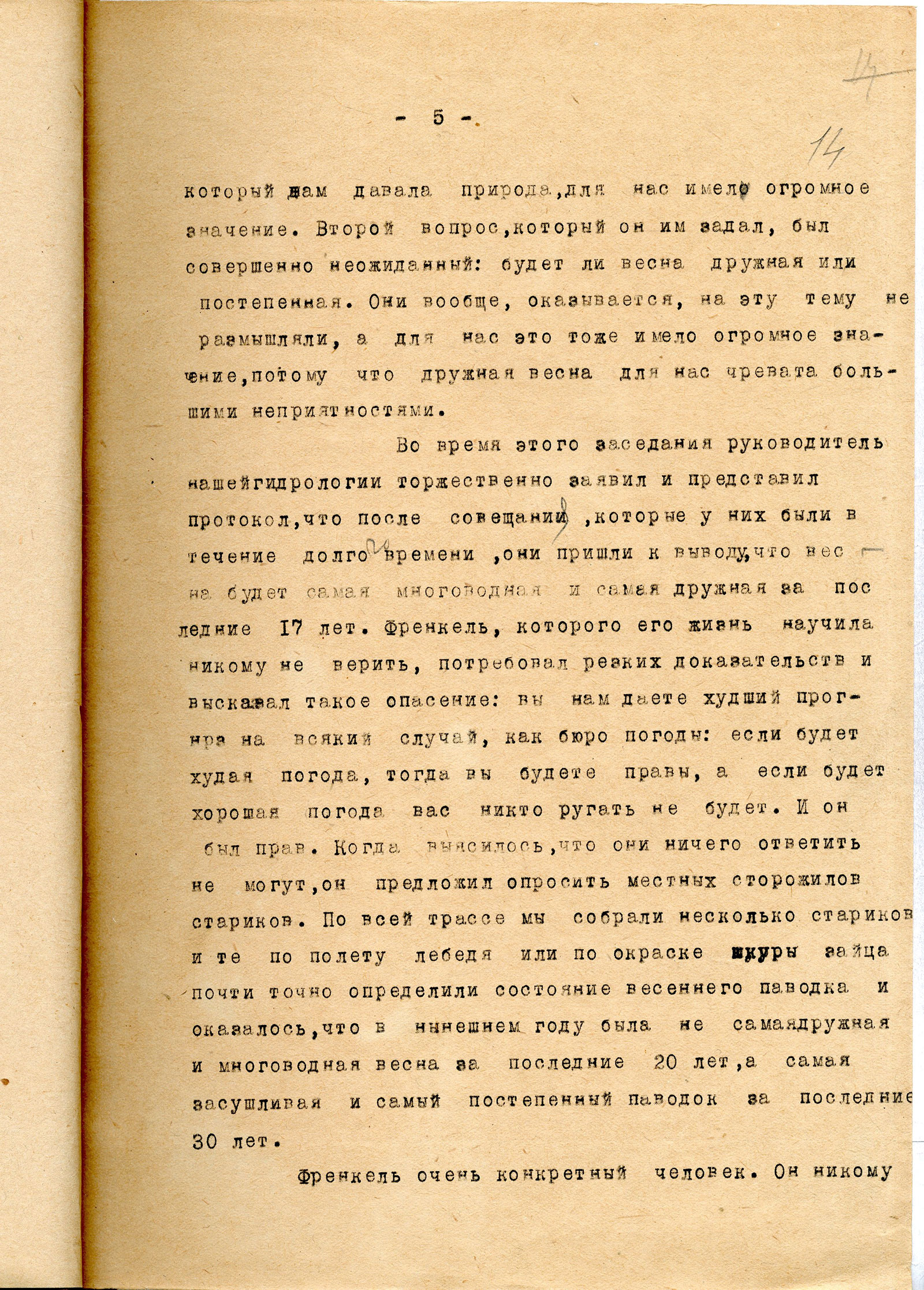Фирин отмечает чрезвычайную дотошность Френкеля именно как организатора потогонной системы, продумавшего множество деталей, обеспечивающих эффективность работ: «Если он видит, что работа на какой-нибудь насыпи мало продвинулась, то он обязательно потребует следующего: он потребует, чтобы по хронометражу прием (так в тексте. — Прим. С. К.) прогнали тачку или машину, и он докажет, как дважды два, что при внимательной работе нужно было насыпать вдвое больше, а так как за этим делом не следят, то возчики уезжают и спят в лесу». По-видимому, Френкель действительно виделся чекистам идеальным менеджером для организации принудительного труда. Фирин постоянно отмечает его конкретность и детальность: «Когда он проходит по трассе, то он не занимается разбором высоких планов и сложных материй, а он посмотрит, как положены катальные доски, в каком состоянии тачка, на которой землекоп работает, обеспечивает ли разворот ручек этой тачки необходимую эффективность работы, не падает ли груз этой тачки больше на передок тачки, чем на колеса».