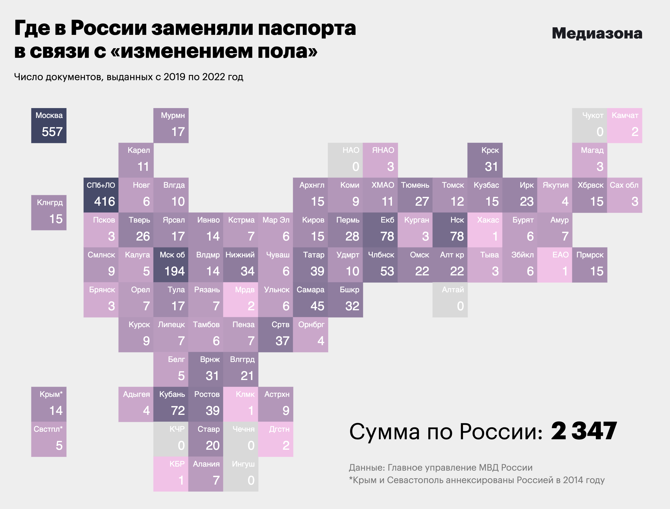 Лидерами по смене гендерного маркера ожидаемо стали столичные агломерации — Москва с Подмосковьем и Петербург с Ленинградской областью. Следом идут регионы с центрами-миллионниками: Новосибирская и Свердловская области, Краснодарский край. В России лишь шесть регионов, где за последние четыре года не выдали ни одного паспорта в связи с «изменением пола»: Ненецкий автономный округ, Чукотка, Республика Алтай, а также три кавказские республики — Ингушетия, Карачаево-Черкессия и Чечня.
