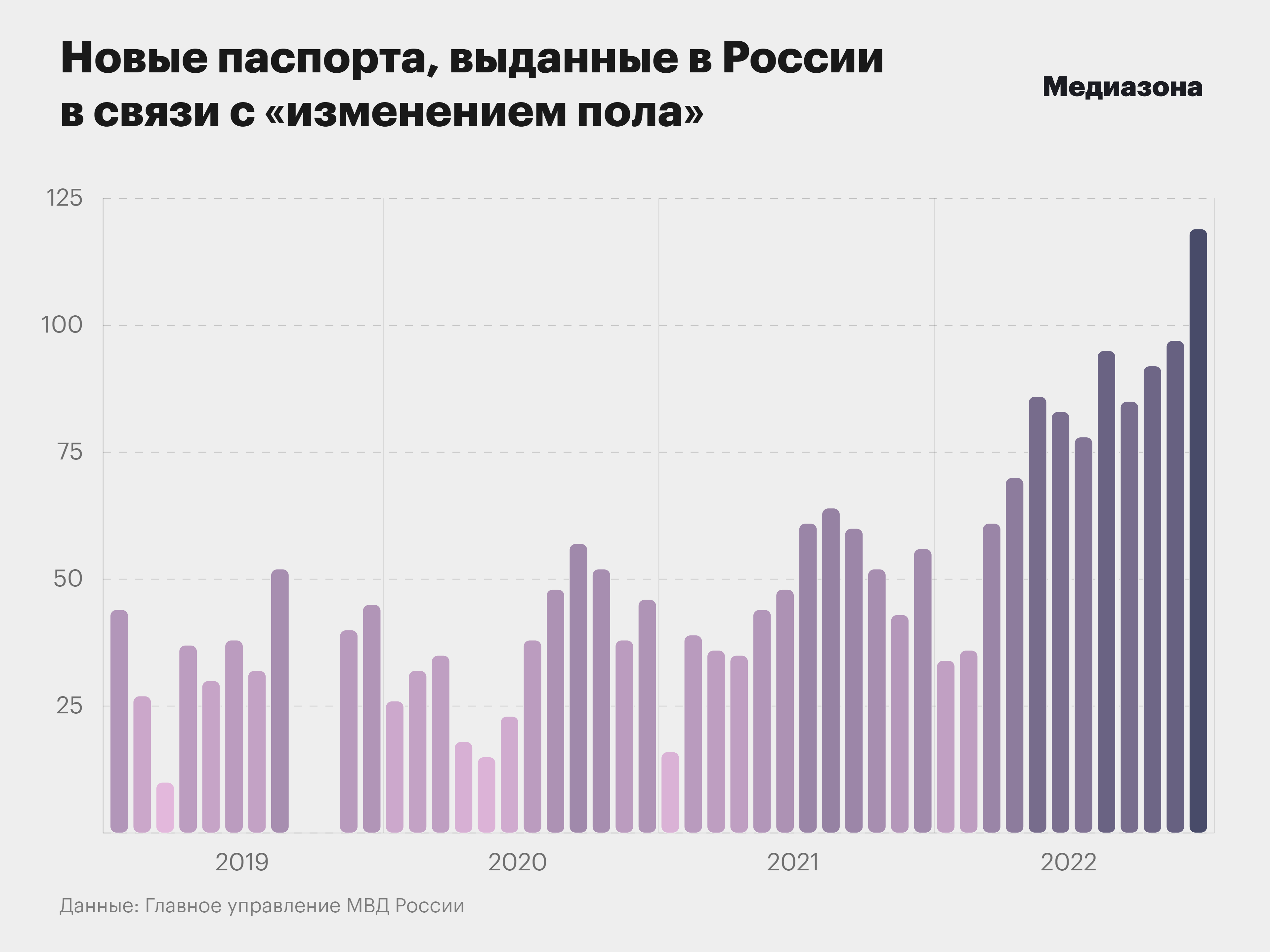 В 2022 году резко выросло число россиян, получивших новый паспорт в связи с «изменением пола», это следует из данных МВД России, которое ежемесячно публикует статистику выдачи паспортов. В ней отдельно учитывается каждая из возможных причин оформления документа, в том числе «изменение пола» (транс-организации рекомендуют называть эту юридическую процедуру «изменением гендерного маркера»).