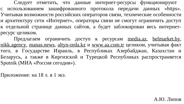 Речь в письме шла о медиа, зарегистрированных в Азербайджане, Беларуси, Израиле, Казахстане, Кыргызстане и Турции. Как указывал Липов, некоторые их публикации российские суды запретили к распространению на территории РФ — в них говорилось об атаках на объекты гражданской инфраструктуры в Украине и многочисленных жертвах среди мирного населения. Шеф РКН писал, что его ведомство требовало удалить публикации, но иностранные сайты не выполнили это требование. Поэтому чиновник предлагал заблокировать их «целиком», но со странной оговоркой — «учитывая факт того, [что] в Государстве Израиль, в Республиках Азербайджан, Казахстан и Беларусь, а также в Киргизской и Турецкой Республиках распространяется Sputnik (МИА "Россия сегодня")».
