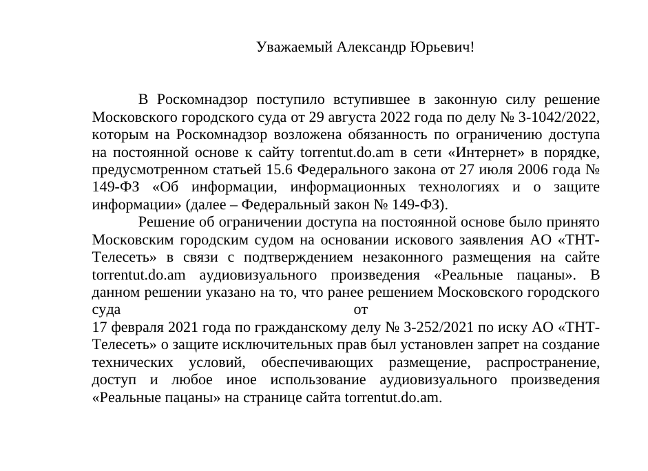 Вероятно, именно поэтому в переписке РКН с АП часто упоминаются торрент-трекеры и пиратские онлайн-кинотеатры. К примеру, в октябре 2022 года после претензий правообладателей Андрей Липов уточнял у Александра Смирнова, можно ли заблокировать армянский торрент-трекер Torrentut.do.am, где выложен сериал «Реальные пацаны».